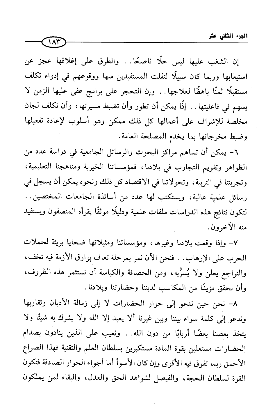 8 - نحن حين ندعو ندعو إلى حوار الحضارات لا إلى زمالة الأديان وتقاربها وندعو إلى كلمة سواء بيننا وبين غيرنا ألا يعبد إلا الله ولا يشرك به شيئًا ولا يتخذ بعضنا بعضًا أربابًا من دون الله .. ونعيب على الذين ينادون بصدام الحضارات مستعلين بقوة المادة مستكبرين بسلطان العلم والتقنية فهذا الصراع الأحمق ربما تفوق فيه الأقوى وإن كان الأسوأ أما أجواء الحوار الصادقة فتكون القوة لسلطان الحجة، والفيصل لشواهد الحق والعدل، والبقاء لمن يملكون