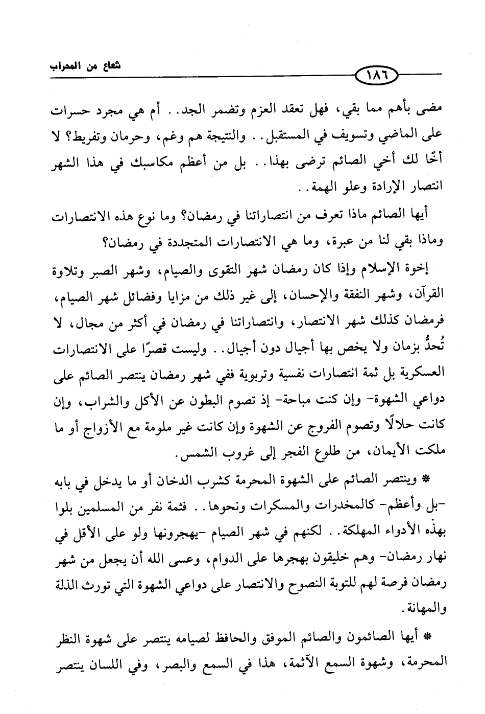 * وينتصر الصائم على الشهوة المحرمة كشرب الدخان أو ما يدخل في بابه- بل وأعظم- كالمخدرات والمسكرات ونحوها .. فثمة نفر من المسلمين بلوا بهذه الأدواء المهلكة .. لكنهم في شهر الصيام- يهجرونها ولو على الأقل في نهار رمضان- وهم خليقون بهجرها على الدوام، وعسى الله أن يجعل من شهر رمضان فرصة لهم على التوبة النصوح والانتصار على دواعي الشهوة التي تورث الذلة والمهانة.