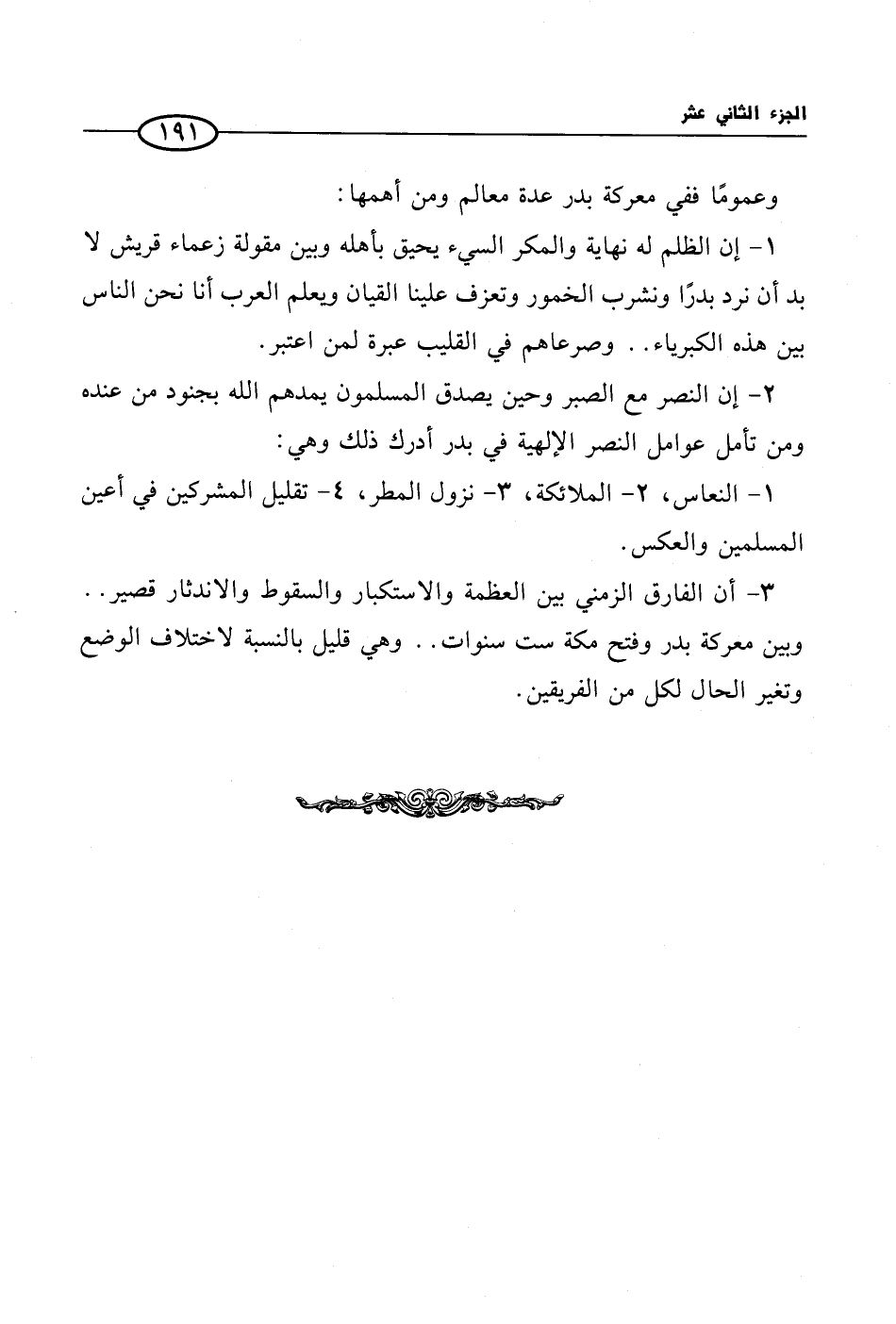 1 - إن الظلم له نهاية والمكر السيء محيق بأهله وبين مقولة زعماء قريش لا بد أن نرد بدرًا ونشرب الخمور وتعزف علينا القنان ويعلم العرب أنا نحن الناس بين هذه الكبرياء .. وصرعاهم في القليب عبرة لمن اعتبر.