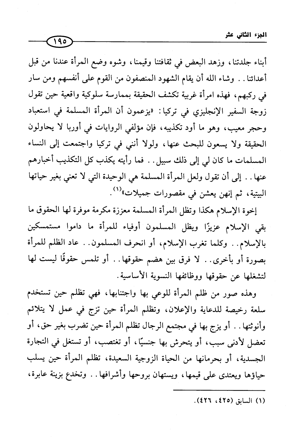 أبناء جلدتنا، وزهد البعض في ثقافتنا وقيمنا، وشوه وضع المرأة عندنا من قبل أعدائنا .. وشاء الله أن يقام الشهود المنصفون من القوم على أنفسهم ومن سار في ركبهم، فهذه امرأة غربية تكشف الحقيقة بممارسة سلوكية واقعية حين تقول زوجة السفير الإنجليزي في تركيا: «يزعمون أن المرأة المسلمة في استعباد وحجر معيب، وهو ما أود تكذيبه، فإن مؤلفي الروايات في أوربا لا يحاولون الحقيقة ولا يسعون للبحث عنها، ولولا أنني في تركيا واجتمعت إلى النساء المسلمات ما كان لي إلى ذلك سبيل .. فما رأيته يكذب كل التكذيب أخبارهم عنها .. إلى أن تقول ولعل المرأة المسلمة هي الوحيدة التي لا تعني بغير حياتها البيتية، ثم إنهن يعشن في مقصورات جميلات» (¬1).