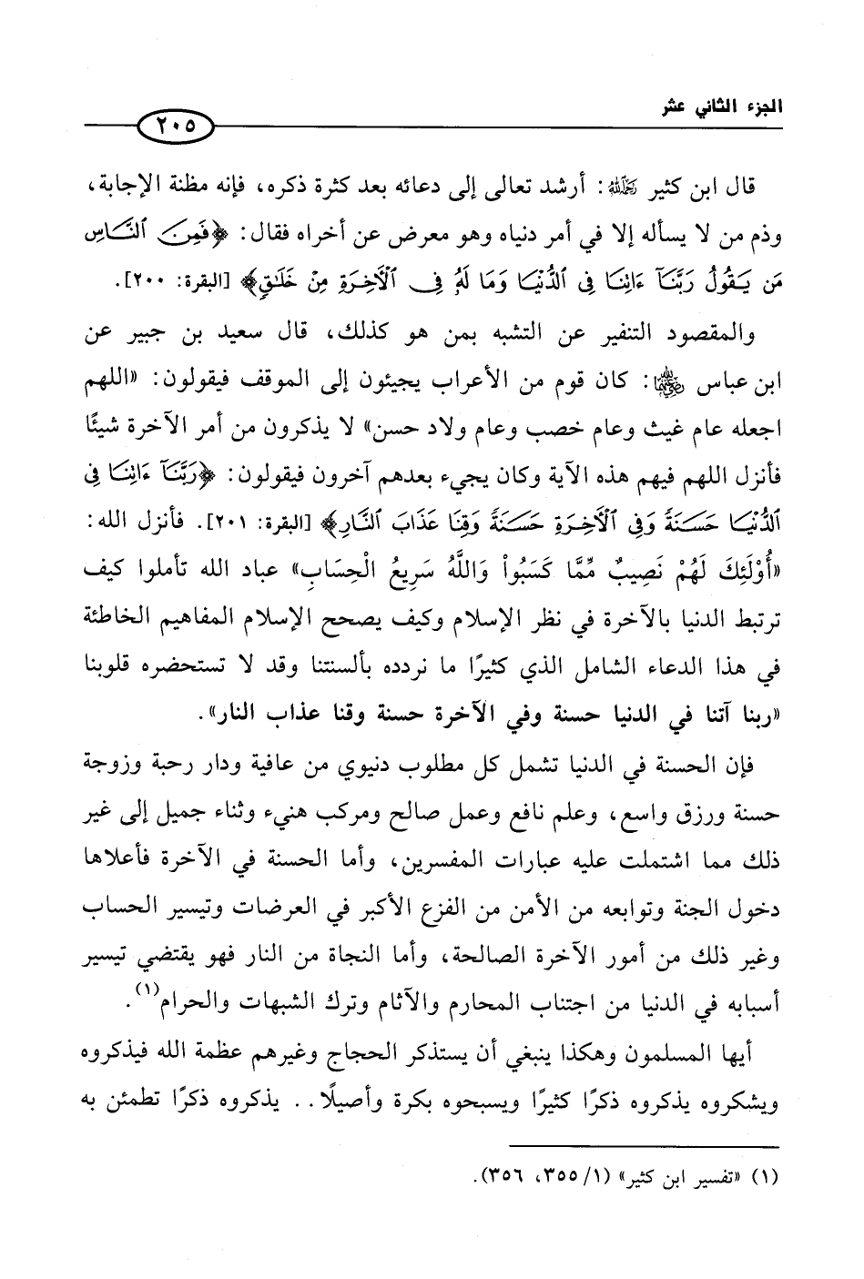وهو المقصود التنفير عن التشبه بمن هو كذلك، قال سعيد بن جبير عن ابن عباس رضي الله عنهما: كان قوم من الأعراب يجيئون إلى الموقف فيقولون: «اللهم اجعله عام غيث وعام خصب وعام ولاد حسن» لا يذكرون من أمر الآخرة شيئًا فأنزل اللهم فيهم هذه الآية وكان يجيء بعدهم آخرون فيقولون: {رَبَّنَا آتِنَا فِي الدُّنْيَا حَسَنَةً وَفِي الآخِرَةِ حَسَنَةً وَقِنَا عَذَابَ النَّارِ}. فأنزل الله: «أُوْلَئِكَ لَهُمْ نَصِيبٌ مِّمَّا كَسَبُوا وَاللَّهُ سَرِيعُ الْحِسَابِ» عباد الله تأملوا كيف ترتبط الدنيا بالآخرة في نظر الإسلام وكيف يصحح الإسلام المفاهيم الخاطئة في هذا الدعاء الشامل الذي كثيرًا ما نردده بألسنتنا وقد لا تستحضره قلوبنا «ربنا آتنا في الدنيا حسنة وفي الآخرة حسنة وقنا عذاب النار».