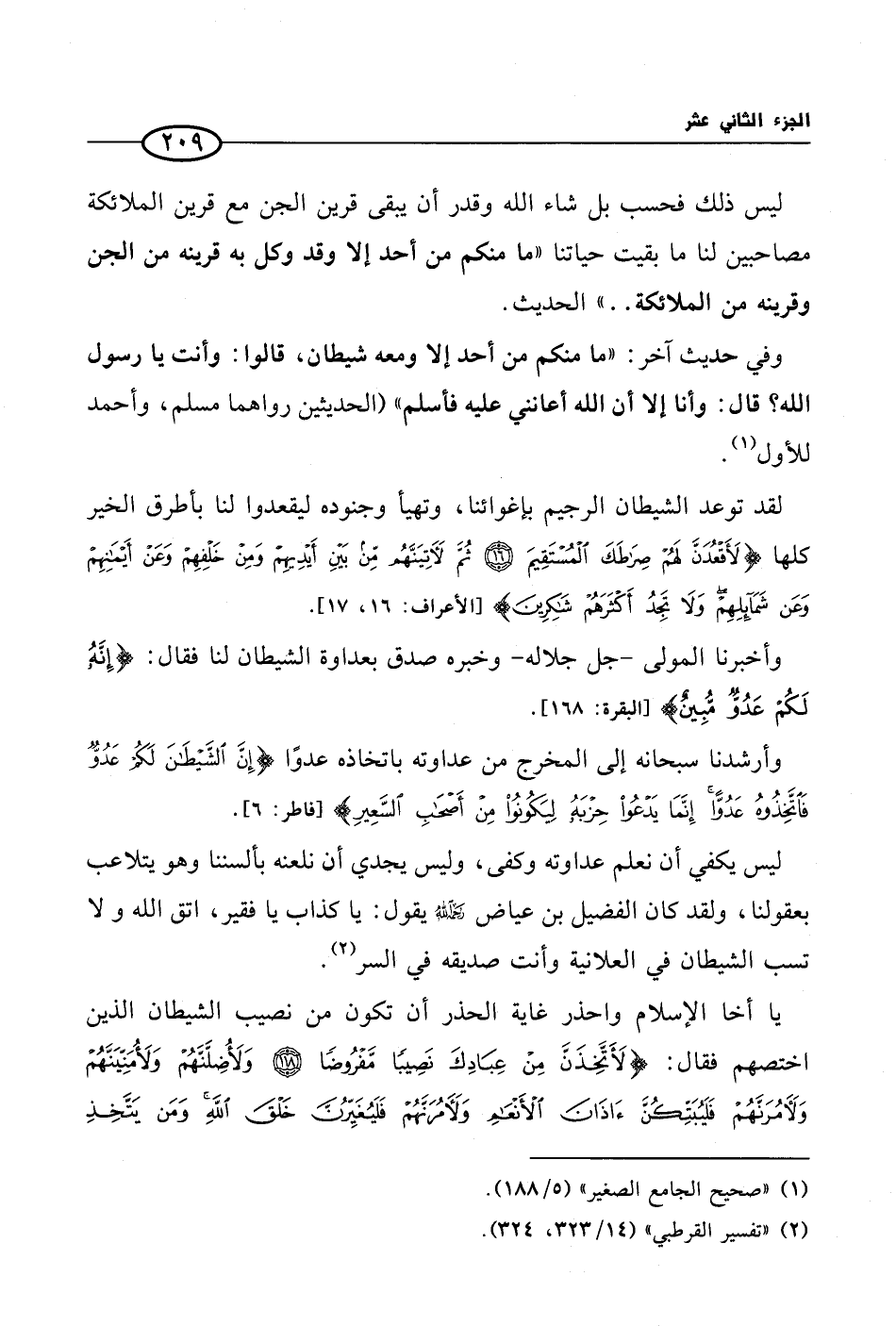 ليس يكفي أن نعلم عداوته وكفى، وليس يجدي أن نلعنه بألسننا وهو يتلاعب بعقولنا، ولقد كان الفضيل بن عياض رحمه الله يقول: يا كذاب يا فقير، اتق الله ولا تسب الشيطان في العلانية وأنت صديقه في السر (¬2).