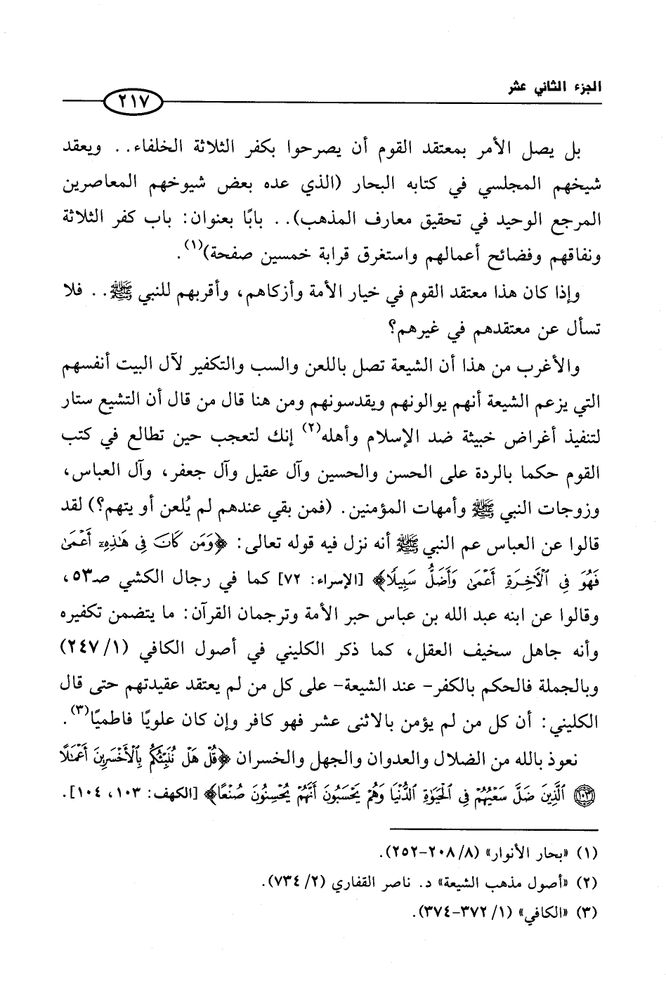 بل يصل الأمر بمعتقد القوم أن يصرحوا بكفر الثلاثة الخلفاء .. ويعقد شيخهم المجلس في كتابه البحار (الذي عده بعض شيوخهم المعاصرين المرجع الوحيد في تحقيق معارف المذهب) .. بابًا بعنوان: باب كفر الثلاثة ونفاقهم وفضائح أعمالهم واستغرق قرابة خمسين صفحة) (¬1).