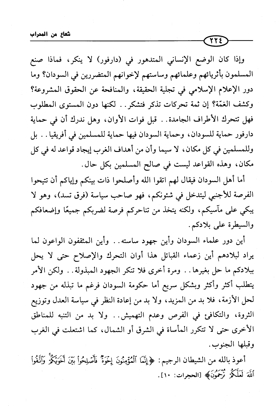 أما أهل السودان فيقال لهم اتقوا الله وأصلحوا ذات بينكم وإياكم أن تتيحوا الفرصة للأجنبي ليتدخل في شئونكم، فهو صاحب سياسة (فرق تسد)، وهو لا يبكي على مآسيكم، ولكنه يتخذ من تناحركم فرصة لضربكم جميعًا وإضعافكم والسيطرة على بلادكم.