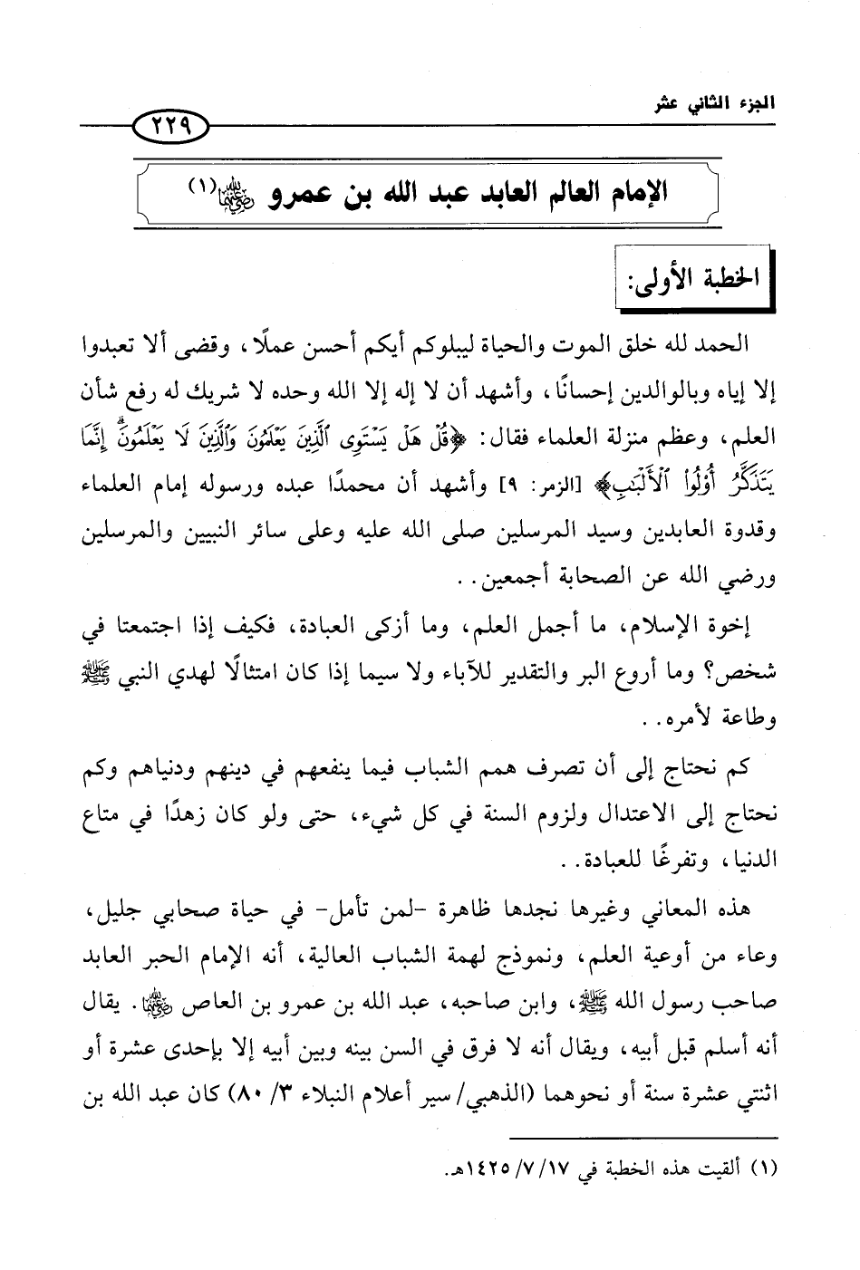 الحمد لله خلق الموت والحياة ليبلوكم أيكم أحسن عملًا، وقضى ألا تعبدوا إلا إياه وبالوالدين إحسانًا، وأشهد أن لا إله إلا الله وحده لا شريك له رفع شأن العلم، وعظم منزلة العلماء فقال: {قُلْ هَلْ يَسْتَوِي الَّذِينَ يَعْلَمُونَ وَالَّذِينَ لا يَعْلَمُونَ إِنَّمَا يَتَذَكَّرُ أُوْلُوا الأَلْبَابِ (9)} وأشهد أن محمدًا عبده ورسوله إمام العلماء وقدوة العابدين وسيد المرسلين صلى الله عليه وعلى سائر النبيين والمرسلين ورضي الله عن الصحابة أجمعين ..