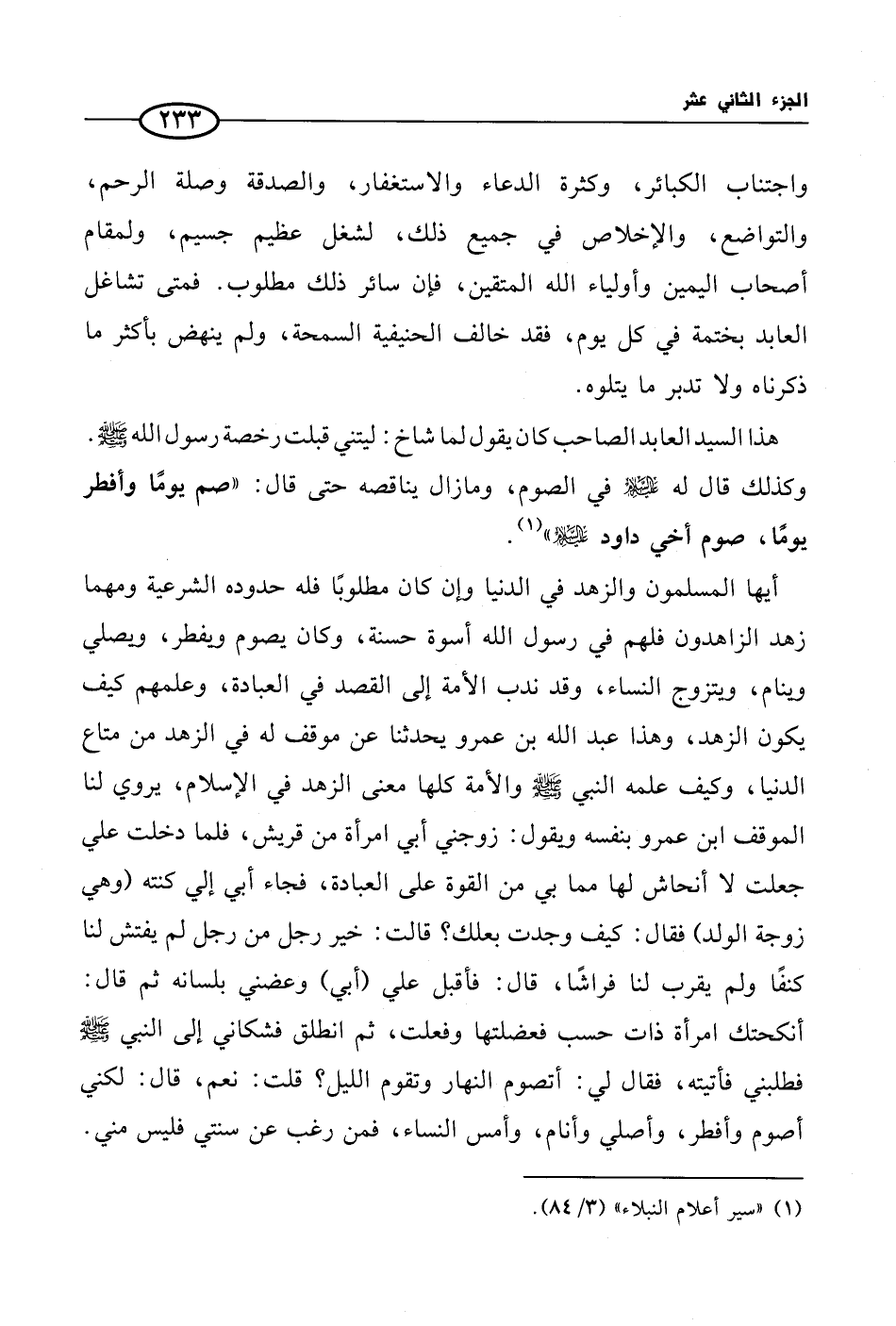 أيها المسلمون والزهد في الدنيا وإن كان مطلوبًا فله حدوده الشرعية ومهما زهد الزاهدون فلهم في رسول الله أسوة حسنة، وكان يصوم ويفطر، ويصلي وينام، ويتزوج النساء، وقد ندب الأمة إلى القصد في العبادة، وعلمهم كيف يكون الزهد، وهذا عبد الله بن عمرو يحدثنا عن موقف له في الزهد من متاع الدنيا، وكيف علمه النبي صلى الله عليه وسلم والأمة كلها معنى الزهد في الإسلام، يروي لنا الموقف ابن عمرو بنفسه ويقول: زوجني أبي امرأة من قريش، فلما دخلت علي جعلت لا أنحاش لها مما بي من القوة على العبادة، فجاء أبي إلي كنته (وهي زوجة الولد) فقال: كيف وجدت بعلك؟ قالت: خير رجل من رجل لم يفتش لنا كنفًا ولم يقرب لنا فراشًا، قال: فأقبل علي (أبي) وعضني بلسانه ثم قال: أنكحتك امرأة ذات حسب فعضلتها وفعلت، ثم انطلق فشكاني إلى النبي صلى الله عليه وسلم فطلبني فأتيته، فقال لي: أتصوم النهار وتقوم الليل؟ قلت: نعم، قال: لكني أصوم وأفطر، وأصلي وأنام، وأمس النساء، فمن رغب عن سنتي فليس مني.