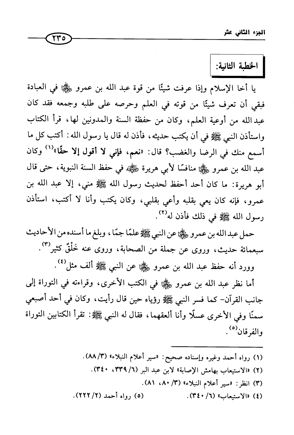 يا أخا الإسلام وإذا عرفت شيئًا من قوة عبد الله بن عمرو رضي الله عنهما في العبادة فبقي أن تعرف شيئًا من قوته في العلم وحرصه على طلبه وجمعه فقد كان عبد الله من أوعية العلم، وكان من حفظة السنة والمدونين لها، قرأ الكتاب واستأذن النبي صلى الله عليه وسلم في أن يكتب حديثه، فأذن له قال يا رسول الله: أكتب كل ما أسمع منك في الرضا والغضب؟ قال: «نعم، فإني لا أقول إلا حقًا» (¬1) وكان عبد الله بن عمرو- رضي الله عنهما- منافسًا لأبي هريرة رضي الله عنه في حفظ السنة النبوية، حتى قال أبو هريرة: ما كان أحد أحفظ لحديث رسول الله صلى الله عليه وسلم مني، إلا عبد الله بن عمرو، فإنه كان يعي بقلبه وأعي بقلبي، وكان يكتب وأنا لا أكتب، استأذن رسول الله صلى الله عليه وسلم في ذلك فأذن له (¬2).