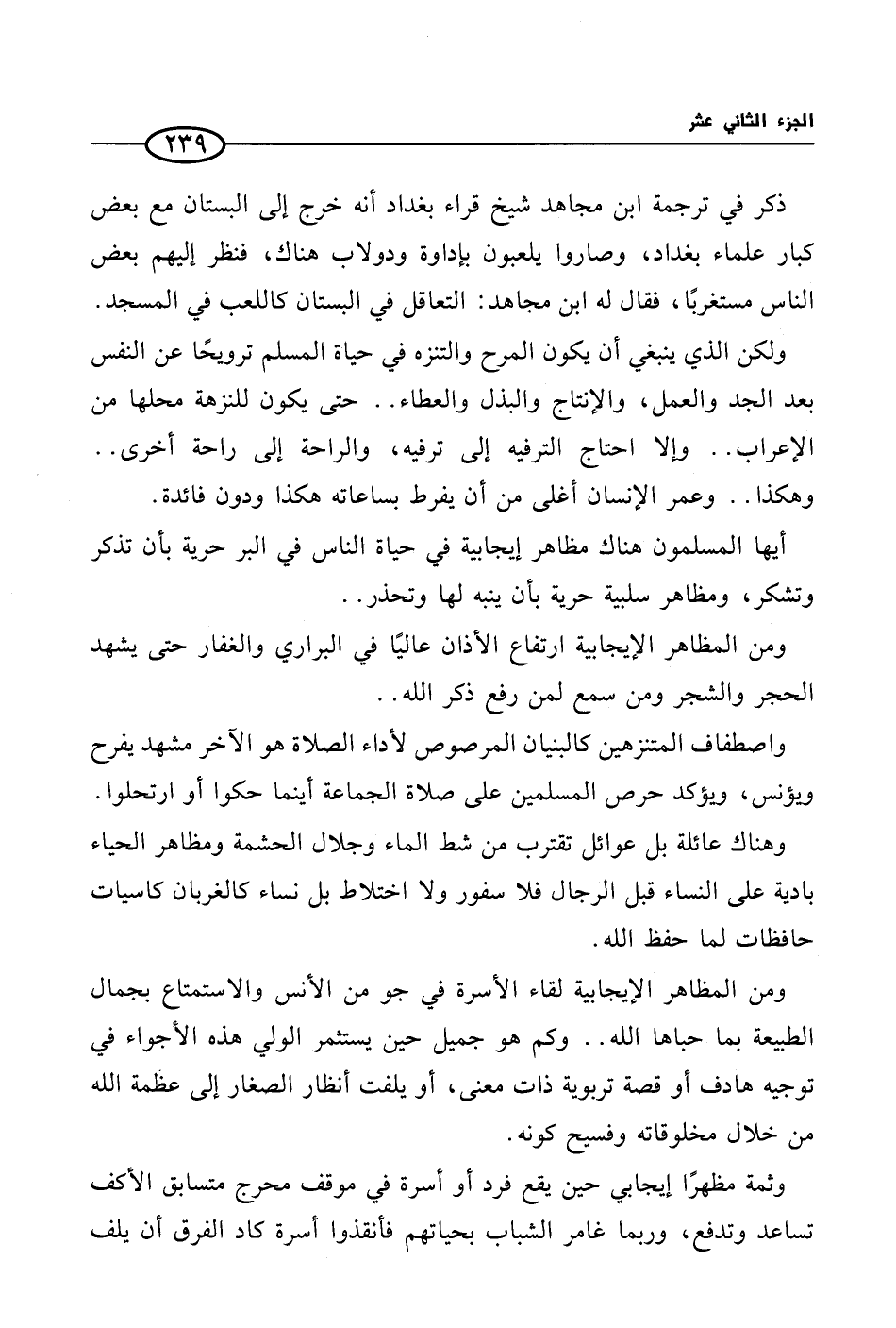 ذكر في ترجمة ابن مجاهد شيخ قراء بغداد أنه خرج إلى البستان مع بعض كبار علماء بغداد، وصاروا يلعبون بإداوة ودولاب هناك، فنظر إليهم بعض الناس مستغربًا، فقال له ابن مجاهد: التعاقل في البستان كاللعب في المسجد.