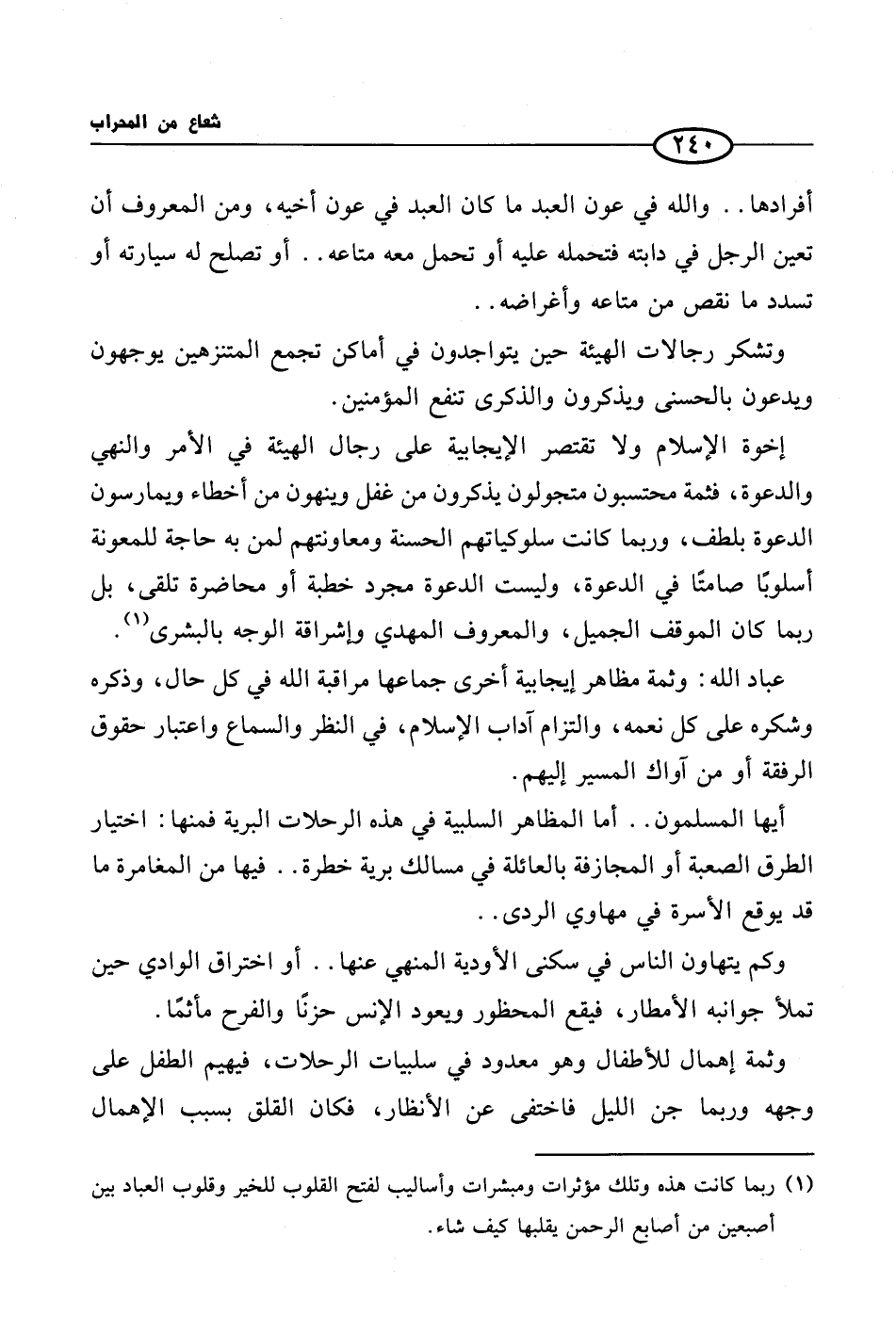 عباد الله وثمة مظاهر إيجابية أخرى جماعها مراقبة الله في كل حال، وذكره وشكره على كل نعمه، والتزام آداب الإسلام، في النظر والسماع واعتبار حقوق الرفقة أو من آواك المسير إليهم.