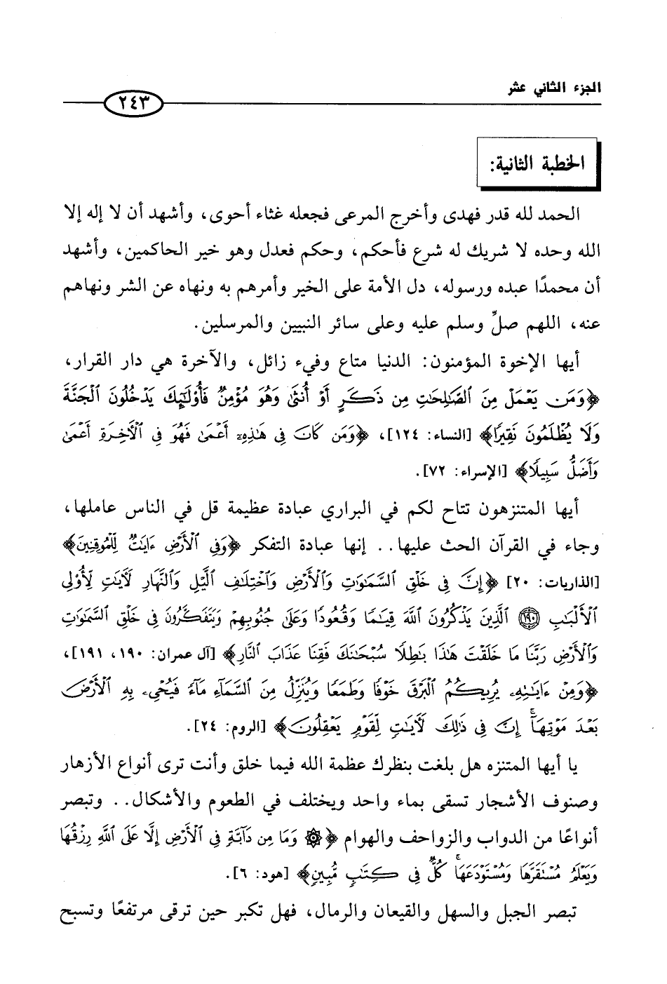 يا أيها المتنزه هل بلغت بنظرك عظمة الله فيما خلق وأنت ترى أنواع الأزهار وصنوف الأشجار تسقى بماء واحد ويختلف في الطعوم والأشكال .. وتبصر أنواعًا من الدواب والزواحف والهوام {وَمَا مِن دَآبَّةٍ فِي الأَرْضِ إِلاَّ عَلَى اللَّهِ رِزْقُهَا وَيَعْلَمُ مُسْتَقَرَّهَا وَمُسْتَوْدَعَهَا كُلٌّ فِي كِتَابٍ مُّبِينٍ}.
