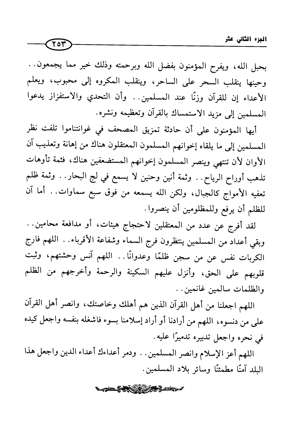 اللهم اجعلنا من أهل القرآن الذين هم أهلك وخاصتك، وانصر أهل القرآن على من دنسوه، اللهم من أرادنا أو أراد إسلامنا بسوء فاشغله بنفسه واجعل كيده في نحره واجعل تدبيره تدميرًا عليه.
