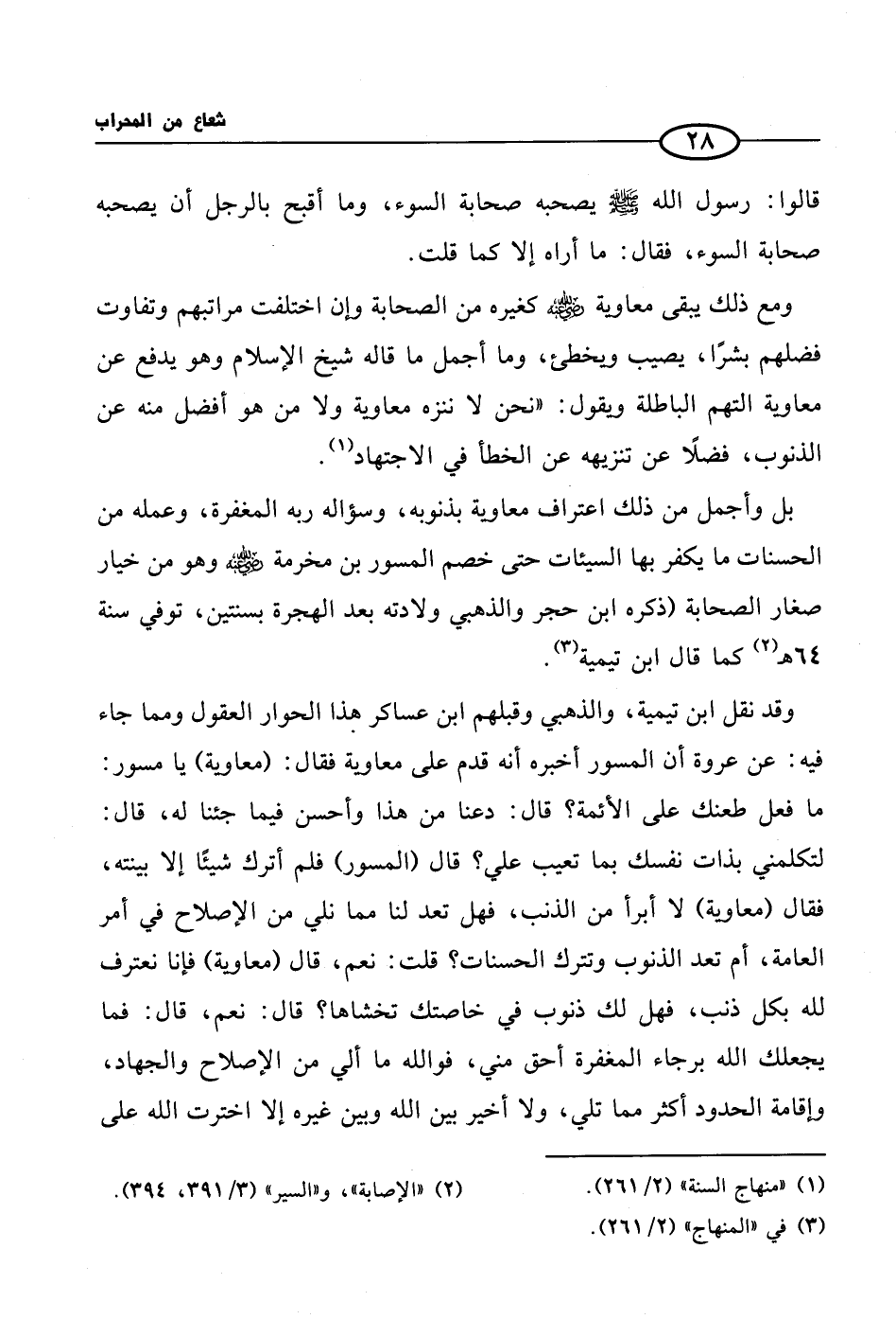 بل وأجمل من ذلك اعتراف معاوية بذنوبه، وسؤاله ربه المغفرة، وعمله من الحسنات ما يكفر بها السيئات حتى خصم المسور بن مخرمة رضي الله عنه وهو من خيار صغار الصحابة (ذكره ابن حجر والذهبي ولادته بعد الهجرة بسنتين، توفي سنة 64 هـ (¬2) كما قال ابن تيمية (¬3).