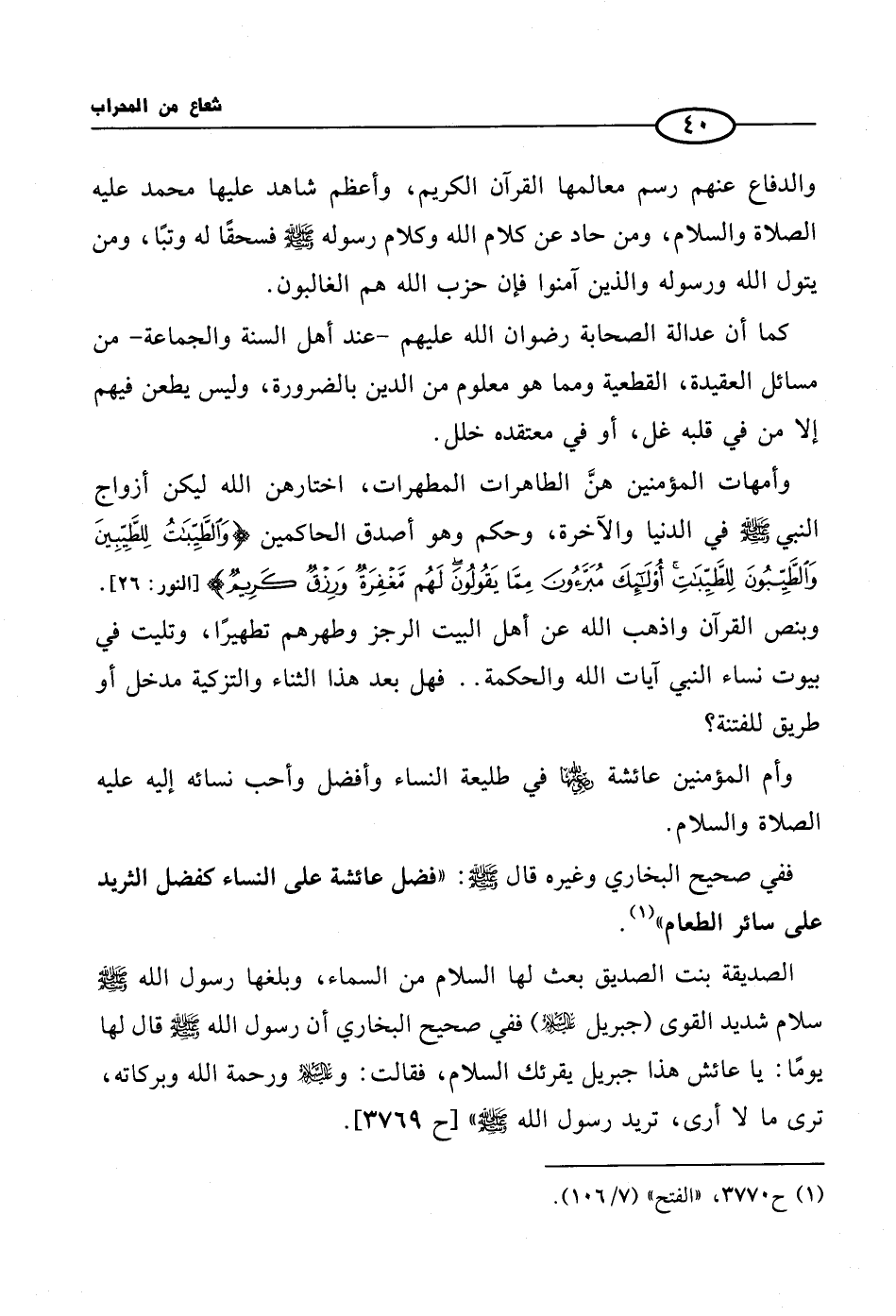 وأمهات المؤمنين هنَّ الطاهرات المطهرات، اختارهن الله ليكن أزواج النبي صلى الله عليه وسلم في الدنيا والآخرة، وحكم وهو أصدق الحاكمين {الطيبات للطيبين والطيبون للطيبات أولئك مبرءون مما يقولون لهم مغفرة ورزق كريم} [النور: 26]. وبنص القرآن واذهب الله عن أهل البيت الرجز وطهرهم تطهيرًا، وتليت في بيوت نساء النبي آيات الله والحكمة .. فهل بعد هذا الثناء والتزكية مدخل أو طريق للفتنة؟