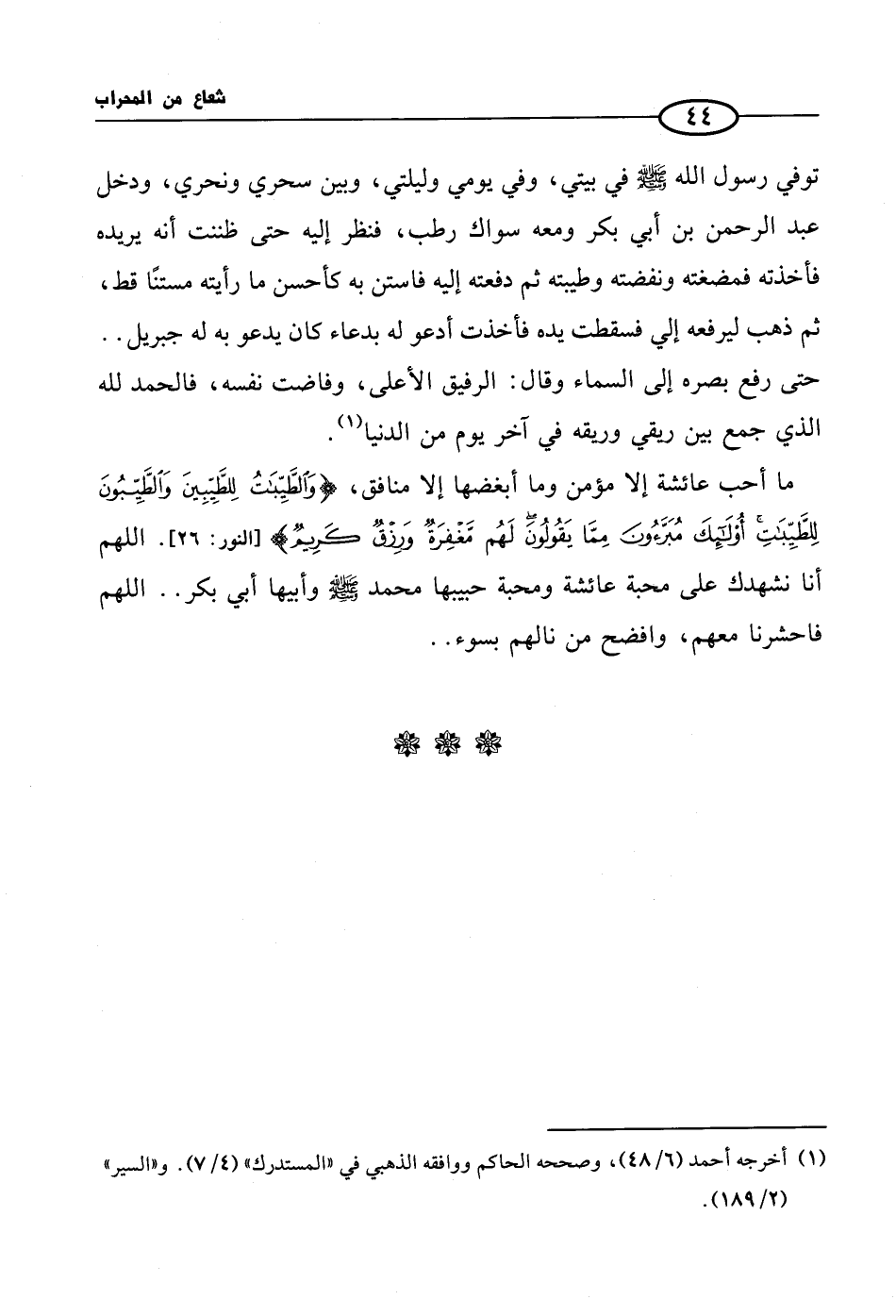ما أحب عائشة إلا مؤمن وما أبغضها إلا منافق، {وَالطَّيِّبَاتُ لِلطَّيِّبِينَ وَالطَّيِّبُونَ لِلطَّيِّبَاتِ أُوْلَئِكَ مُبَرَّؤُونَ مِمَّا يَقُولُونَ لَهُم مَّغْفِرَةٌ وَرِزْقٌ كَرِيمٌ} [النور: 26]. اللهم أنا نشهدك على محبة عائشة ومحبة حبيبها محمد صلى الله عليه وسلم وأبيها أبي بكر .. اللهم فاحشرنا معهم، وافضح من نالهم بسوء ..