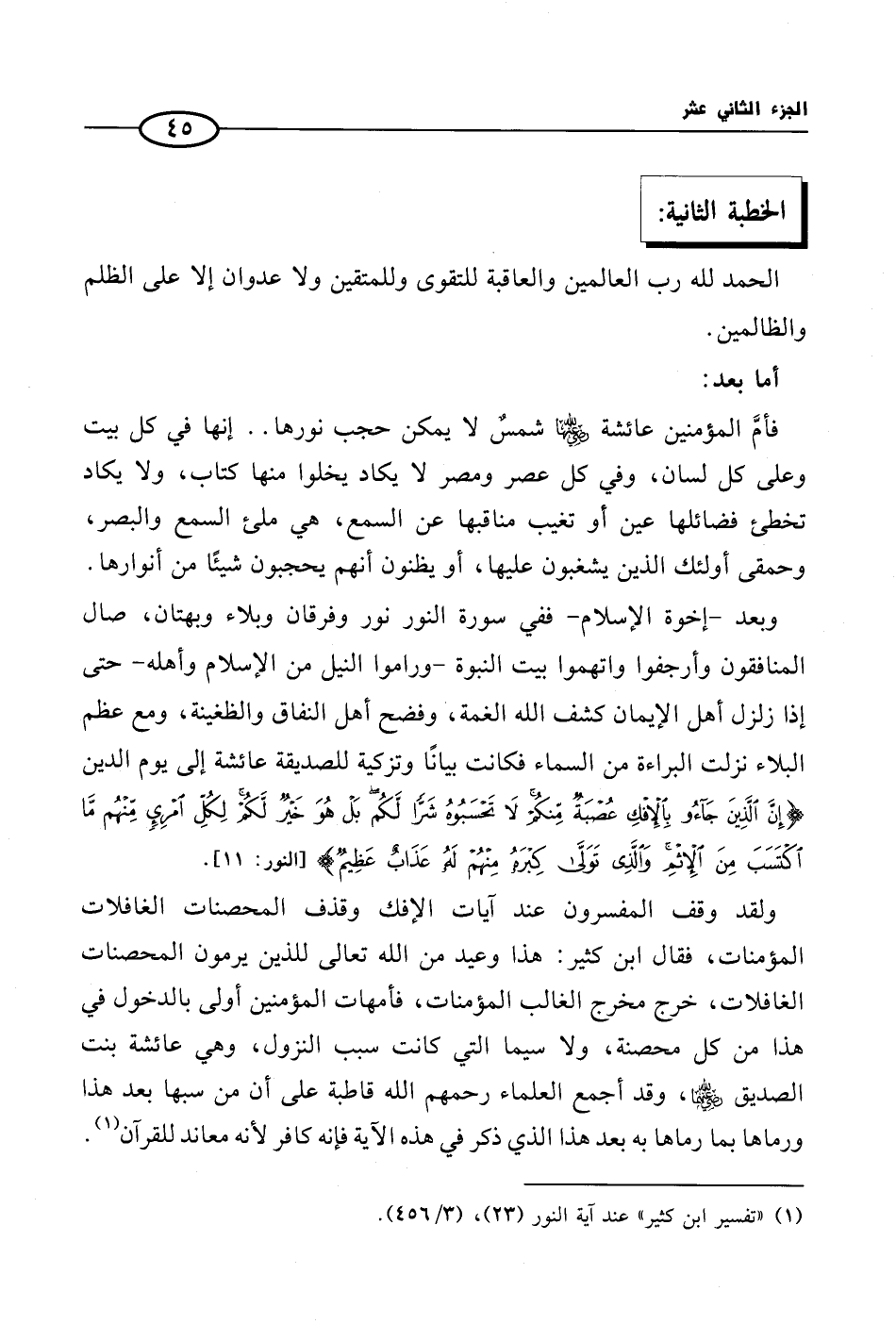 وبعد - إخوة الإسلام - ففي سورة النور نور وفرقان وبلاء وبهتان، صال المنافقون وأرجفوا واتهموا بيت النبوة - وراموا النيل من الإسلام وأهله - حتى إذا زلزل أهل الإيمان كشف الله الغمة، وفضح أهل النفاق والظغينة، ومع عظم البلاء نزلت البراءة من السماء فكانت بيانًا وتزكية للصديقة عائشة إلى يوم الدين {إِنَّ الَّذِينَ جَاؤُو بِالإِفْكِ عُصْبَةٌ مِّنكُمْ لا تَحْسَبُوهُ شَرًّا لَّكُم بَلْ هُوَ خَيْرٌ لَّكُمْ لِكُلِّ امْرِئٍ مِّنْهُم مَّا اكْتَسَبَ مِنَ الإِثْمِ وَالَّذِي تَوَلَّى كِبْرَهُ مِنْهُمْ لَهُ عَذَابٌ عَظِيمٌ}.