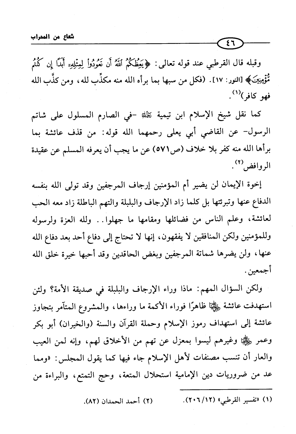 كما نقل شيخ الإسلام ابن تيمية رحمه الله- في الصارم المسلول على شاتم الرسول- عن القاضي أبي يعلى رحمهما الله قوله: من قذف عائشة بما برأها الله منه كفر بلا خلاف (صـ 571) عن ما يجب أن يعرفه المسلم عن عقيدة الروافض (¬2).