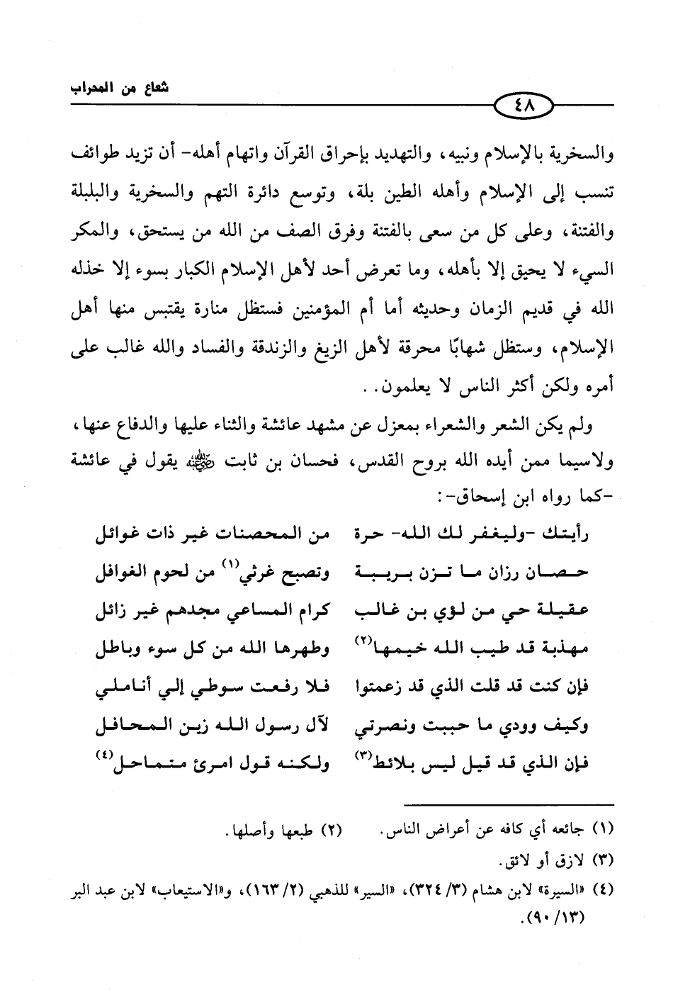 ولم يكن الشعر والشعراء بمعزل عن مشهد عائشة والثناء عليها والدفاع عنها، ولاسيما ممن أيده الله بروح القدس، فحسان بن ثابت رضي الله عنه يقول في عائشة -كما رواه ابن إسحاق-: