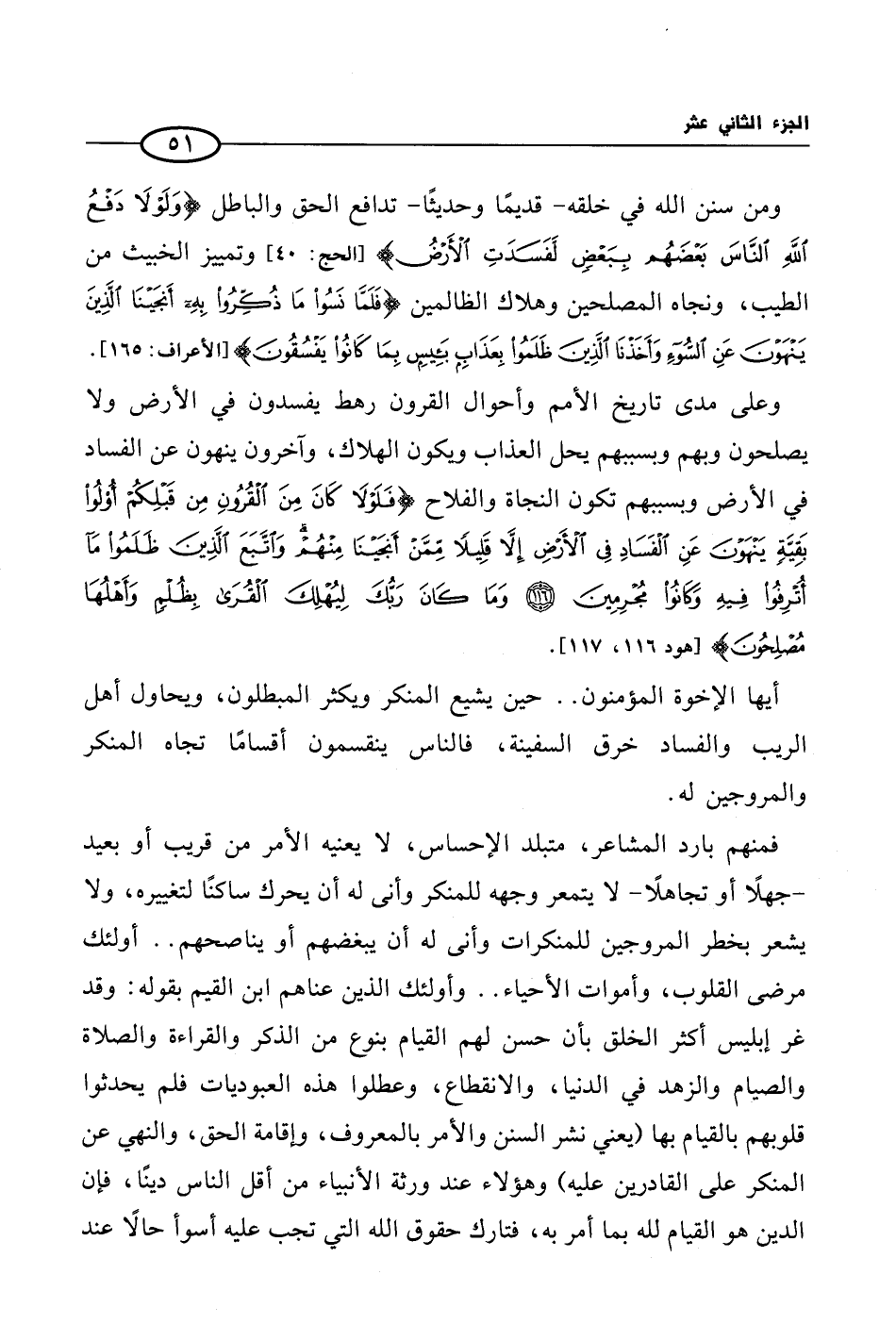 وعلى مدى تاريخ الأمم وأحوال القرون رهط يفسدون في الأرض ولا يصلحون وبهم وبسببهم يحل العذاب ويكون الهلاك، وآخرون ينهون عن الفساد في الأرض وبسببهم تكون النجاة والفلاح {فَلَوْلاَ كَانَ مِنَ الْقُرُونِ مِن قَبْلِكُمْ أُوْلُوا بَقِيَّةٍ يَنْهَوْنَ عَنِ الْفَسَادِ فِي الأَرْضِ إِلاَّ قَلِيلًا مِّمَّنْ أَنجَيْنَا مِنْهُمْ وَاتَّبَعَ الَّذِينَ ظَلَمُوا مَا أُتْرِفُوا فِيهِ وَكَانُوا مُجْرِمِينَ (116) وَمَا كَانَ رَبُّكَ لِيُهْلِكَ الْقُرَى بِظُلْمٍ وَأَهْلُهَا مُصْلِحُونَ} [هود 116، 117].
