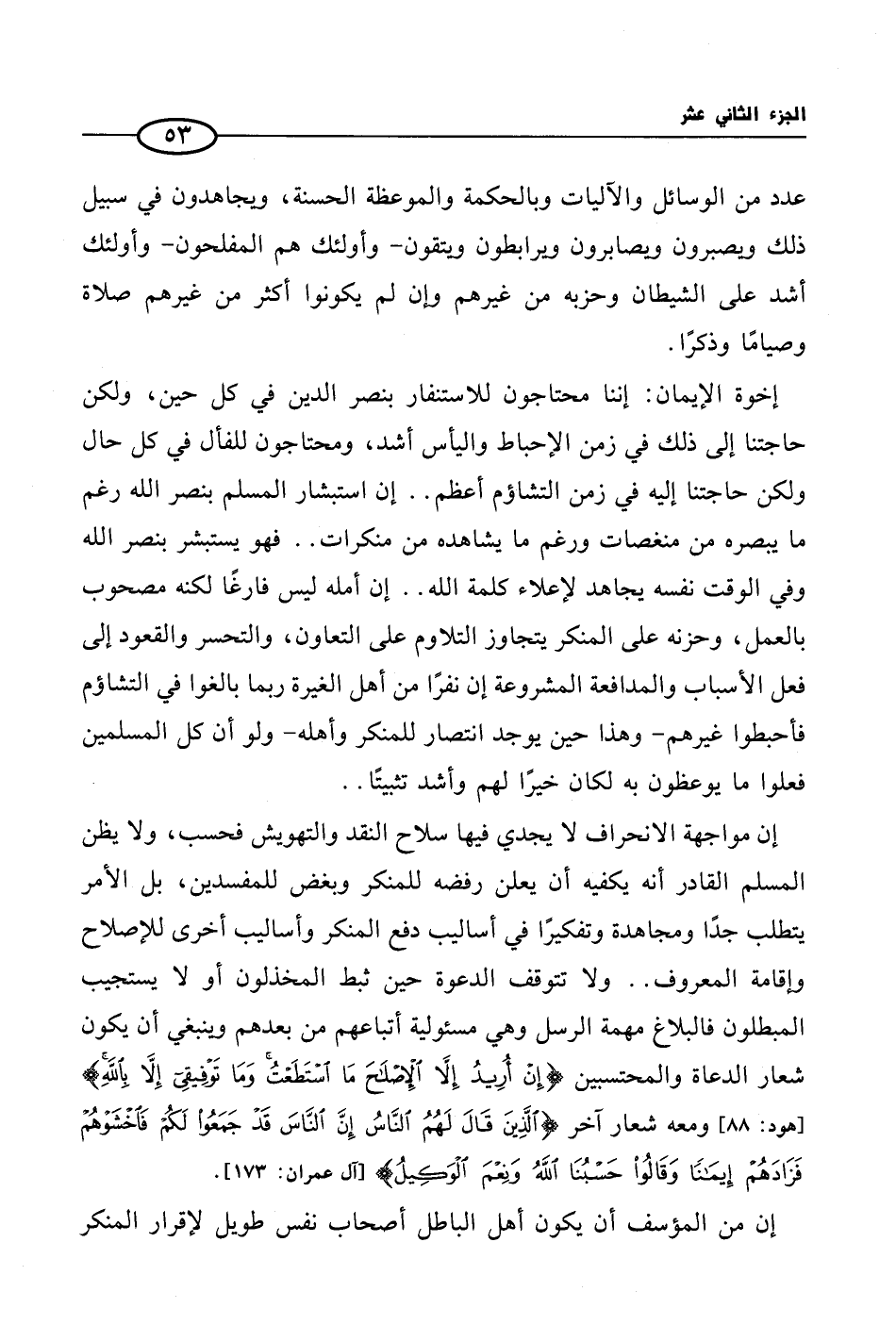 عدد من الوسائل والآليات وبالحكمة والموعظة الحسنة، ويجاهدون في سبيل ذلك ويصبرون ويصابرون ويرابطون ويتقون- وأولئك هم المفلحون- وأولئك أشد على الشيطان وحزبه من غيرهم وإن لم يكونوا أكثر من غيرهم صلاة وصيامًا وذكرًا.