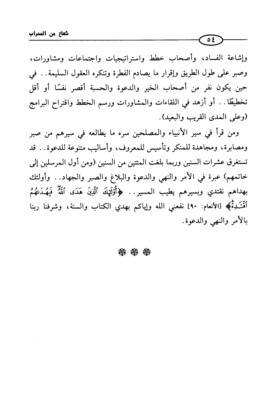 ومن قرأ في سير الأنبياء والمصلحين سره ما يطالعه في سيراهم من صبر ومصابرة، ومجاهدة للمنكر وتأسيس للمعروف، وأساليب متنوعة للدعوة .. قد تستغرق عشرات السنين وربما بلغت المائتين من السنين (ومن أول المرسلين إلى خاتمهم) عبرة في الأمر والنهي والدعوة والبلاغ والصبر والجهاد .. وأولئك بهداهم نقتدي وبسيرهم يطيب المسير .. {أُوْلَئِكَ الَّذِينَ هَدَى اللَّهُ فَبِهُدَاهُمُ اقْتَدِهْ} نفعني الله وإياكم.