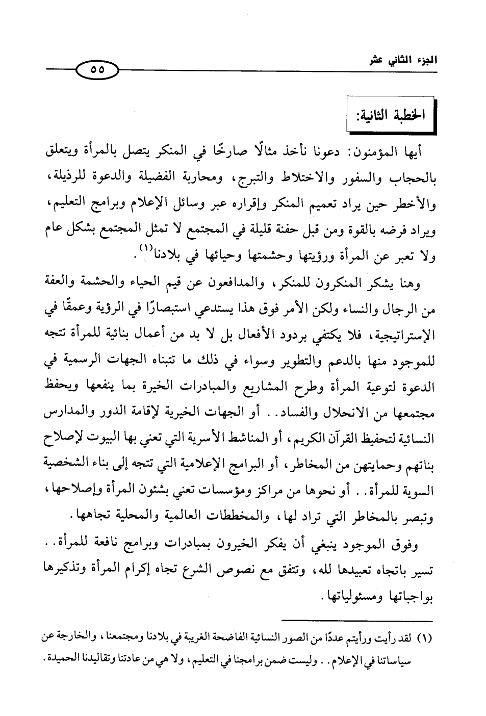 أيها المؤمنون ودعونا نأخذ مثالًا صارخًا في المنكر يتصل بالمرأة ويتعلق بالحجاب والسفور والاختلاط والتبرج، ومحاربة الفضيلة والدعوة للرذيلة، والأخطر حين يراد تعميم المنكر وإقراره عبر وسائل الإعلام وبرامج التعليم، ويراد فرضه بالقوة ومن قبل خفية قليلة في المجتمع لا تمثل المجتمع بشكل عام ولا تعبر عن المرأة ورؤيتها وحشمتها وحياءها في بلادنا (¬1).