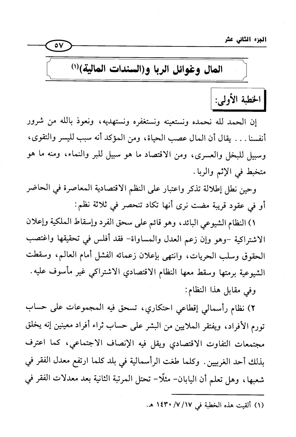 إن الحمد لله نحمده ونستعينه ونستغفره ونستهديه، ونعوذ بالله من شرور أنفسنا ... يقال أن المال عصب الحياة، ومن المؤكد أنه سبب لليسر والتقوى، وسبيل للبخل والعسرى، ومن الاقتصاد ما هو سبيل للبر والنماء، ومنه ما هو متخبط في الإثم والربا.