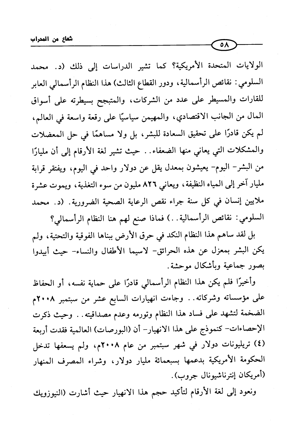 الولايات المتحدة الأمريكية؟ كما تشير الدراسات إلى ذلك (د. محمد السلومي: نقائص الرأسمالية، ودور القطاع الثالث) هذا النظام الرأسمالي العابر للقارات والمسيطر على عدد من الشركات، والمتبجح بسيطرته على أسواق المال من الجانب الاقتصادي، والمهيمن سياسيًا على رقعة واسعة في العالم، لم يكن قادرًا على تحقيق السعادة للبشر، بل ولا مساهمًا في حل المعضلات والمشكلات التي يعاني منها الضعفاء .. حيث تشير لغة الأرقام إلى أن مليارًا من البشر- اليوم- يعيشون بمعدل يقل عن دولار واحد في اليوم، ويفتقر قرابة مليار آخر إلى المياه النظيفة، ويعاني 826 مليون من سوء التغذية، ويموت عشرة ملايين إنسان في كل سنة جراء نقص الرعاية الصحية الضرورية. (د. محمد السلومي: نقائص الرأسمالية .. ) فماذا صنع لهم هنا النظام الرأسمالي؟