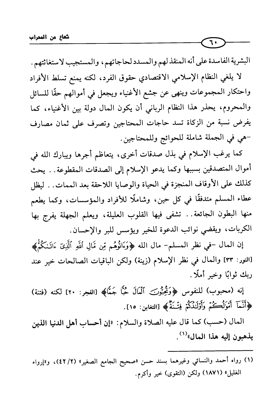 إن المال- في نظر المسلم- مال الله {وآتوهم من مال الله الذي آتاكم} والمال في نظر الإسلام (زينة) ولكن الباقيات الصالحات خير عند ربك ثوابًا وخير أملًا.