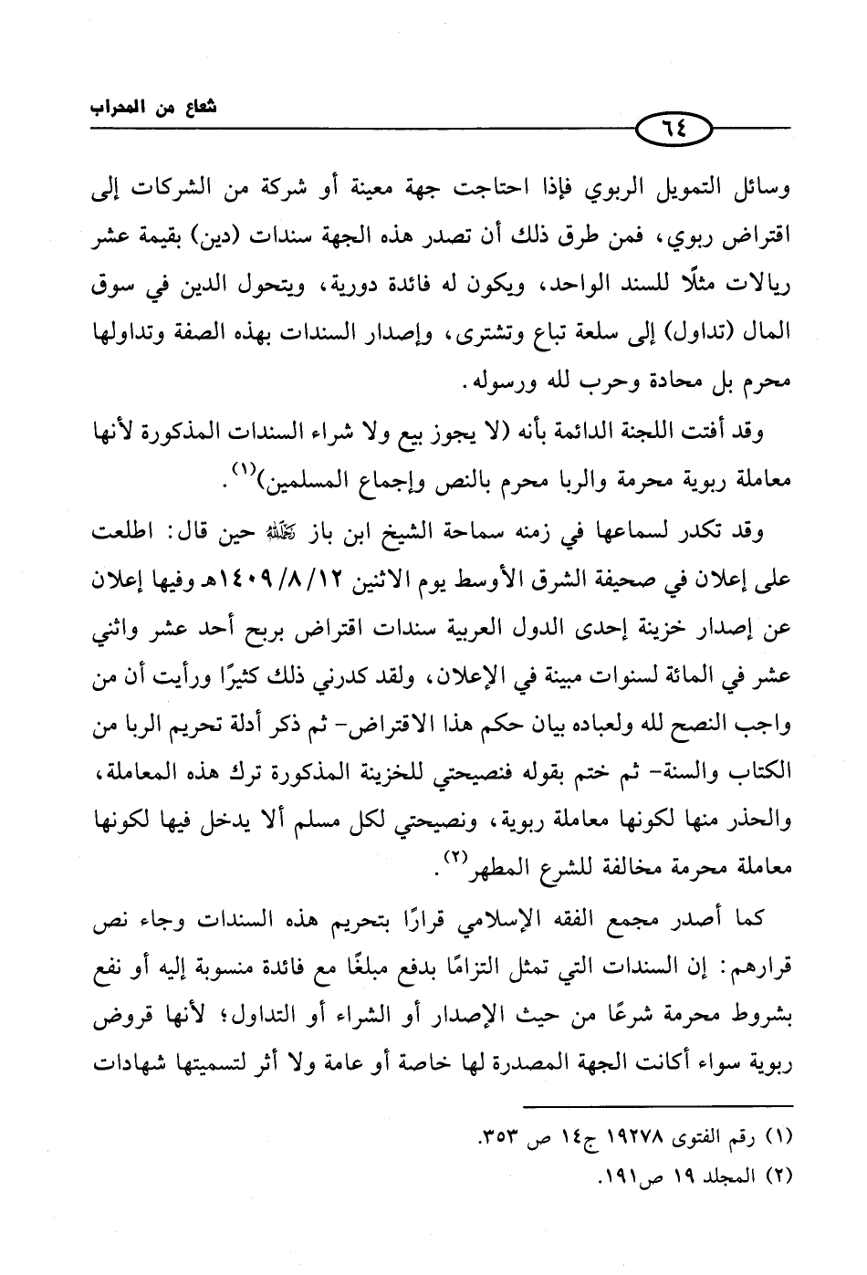 وقد تكدر لسماعها في زمنه سماحة الشيخ ابن باز رحمه الله حين قال: اطلعت على إعلان في صحيفة الشرق الأوسط يوم الاثنين 12/ 8/ 1409 هـ وفيها إعلان عن إصدار خزينة إحدى الدول العربية سندات اقتراض بربح أحد عشر واثني عشر في المائة لسنوات مبينة في الإعلان، ولقد كدرني ذلك كثيرًا ورأيت أن من واجب النصح لله ولعباده بيان حكم هذا الاقتراض- ثم ذكر أدلة تحريم الربا من الكتاب والسنة- ثم ختم بقوله فنصيحتي للخزينة المذكورة ترك هذه المعاملة، والحذر منها لكونها معاملة ربوية، ونصيحتي لكل مسلم ألا يدخل فيها لكونها معاملة محرمة مخالفة للشرع المطهر (¬2).