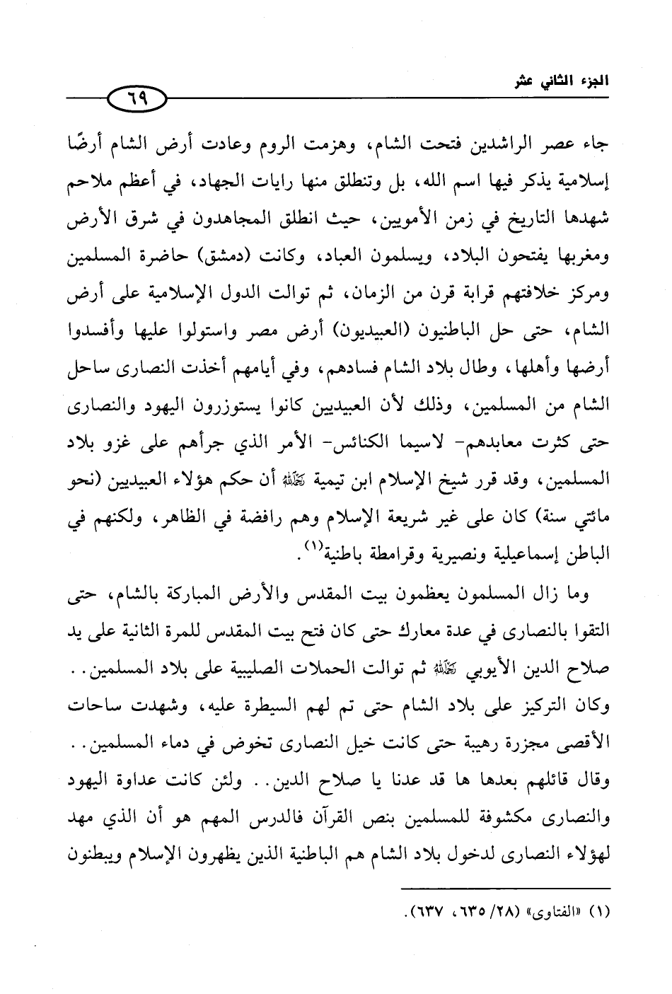جاء عصر الراشدين فتحت الشام، وهزمت الروم وعادت أرض الشام أرضًا إسلامية يذكر فيها اسم الله، بل وتنطلق منها رايات الجهاد، في أعظم ملاحم شهدها التاريخ في زمن الأمويين، حيث انطلق المجاهدون في شرق الأرض ومغربها يفتحون البلاد، ويسلمون العباد، وكانت (دمشق) حاضرة المسلمين ومركز خلافتهم قرابة قرن من الزمان، ثم توالت الدول الإسلامية على أرض الشام، حتى حل الباطنيون (العبيديون) أرض مصر واستولوا عليها وأفسدوا أرضها وأهلها، وطال بلاد الشام فسادهم، وفي أيامهم أخذت النصارى ساحل الشام من المسلمين، وذلك لأن العبيديين كانوا يستوزرون اليهود والنصارى حتى كثرت معابدهم- لاسيما الكنائس- الأمر الذي جرأهم على غزو بلاد المسلمين، وقد قرر شيخ الإسلام ابن تيمية رحمه الله أن حكم هؤلاء العبيديين (نحو مائتي سنة) كان على غير شريعة الإسلام وهم رافضة في الظاهر، ولكنهم في الباطن إسماعيلية ونصيرية وقرامطة باطنية (¬1).
