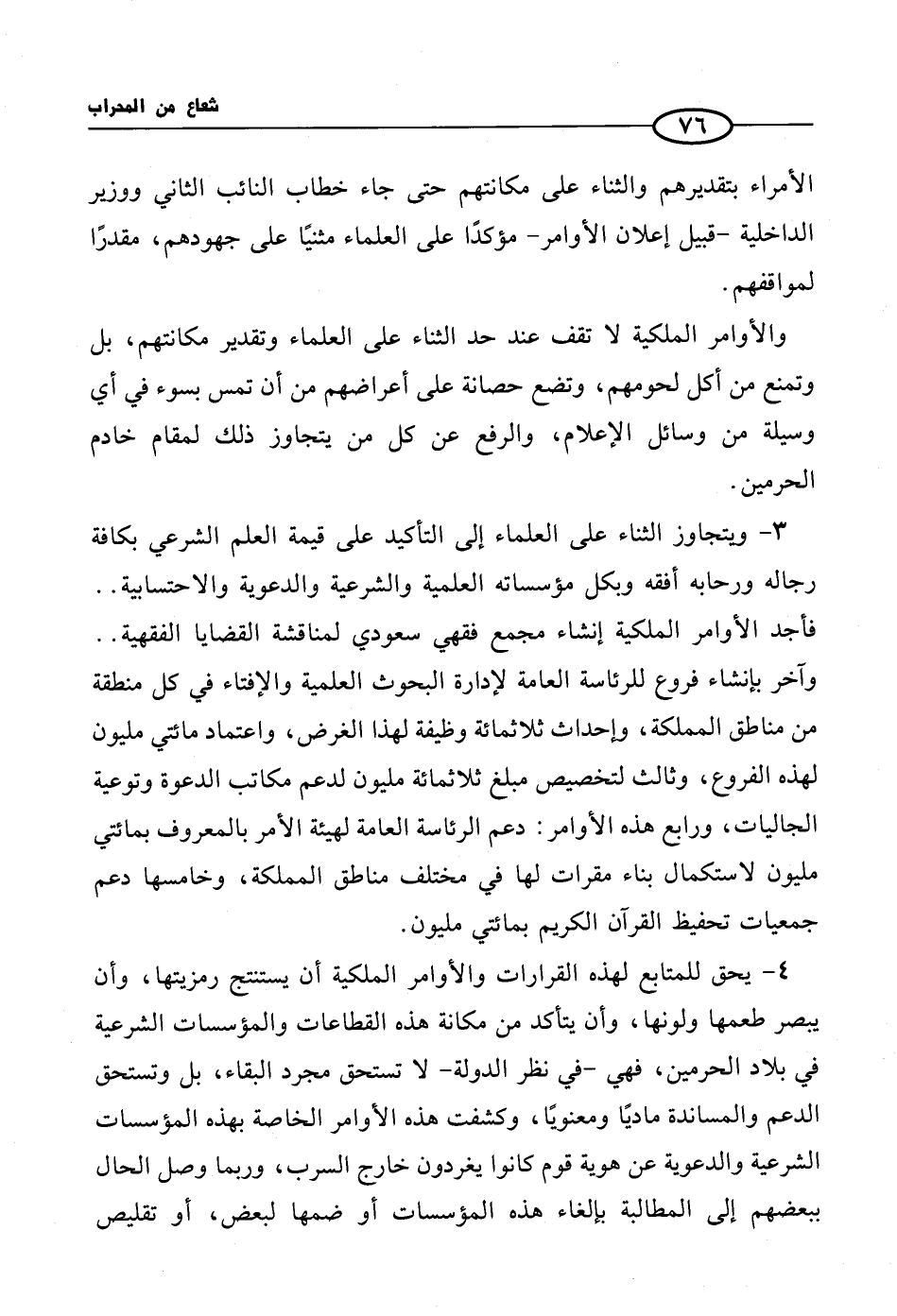 3 - ويتجاوز الثناء على العلماء إلى التأكيد على قيمة العلم الشرعي بكافة رجاله ورحابه وبكل مؤسساته العلمية والشرعية والدعوية والاحتسابية .. فأخذ الأوامر الملكية إنشاء مجمع فقهي سعودي لمناقشة القضايا الفقهية .. وآخر بإنشاء فروع للرئاسة العامة لإدارة البحوث العلمية والإفتاء في كل منطقة من مناطق المملكة، وإحداث ثلاثمائة وظيفة لهذا الغرض، واعتماد مائتي مليون لهذه الفروع، وثالث لتخصيص مبلغ ثلاثمائة مليون لدعم مكاتب الدعوة وتوعية الجاليات، ورابع هذه الأوامر: دعم الرئاسة العامة لهيئة الأمر بالمعروف بمائتي مليون لاستكمال بناء مقرات لها في مختلف مناطق المملكة، وخامسها دعم جمعيات تحفيظ القرآن الكريم بمائتي مليون.