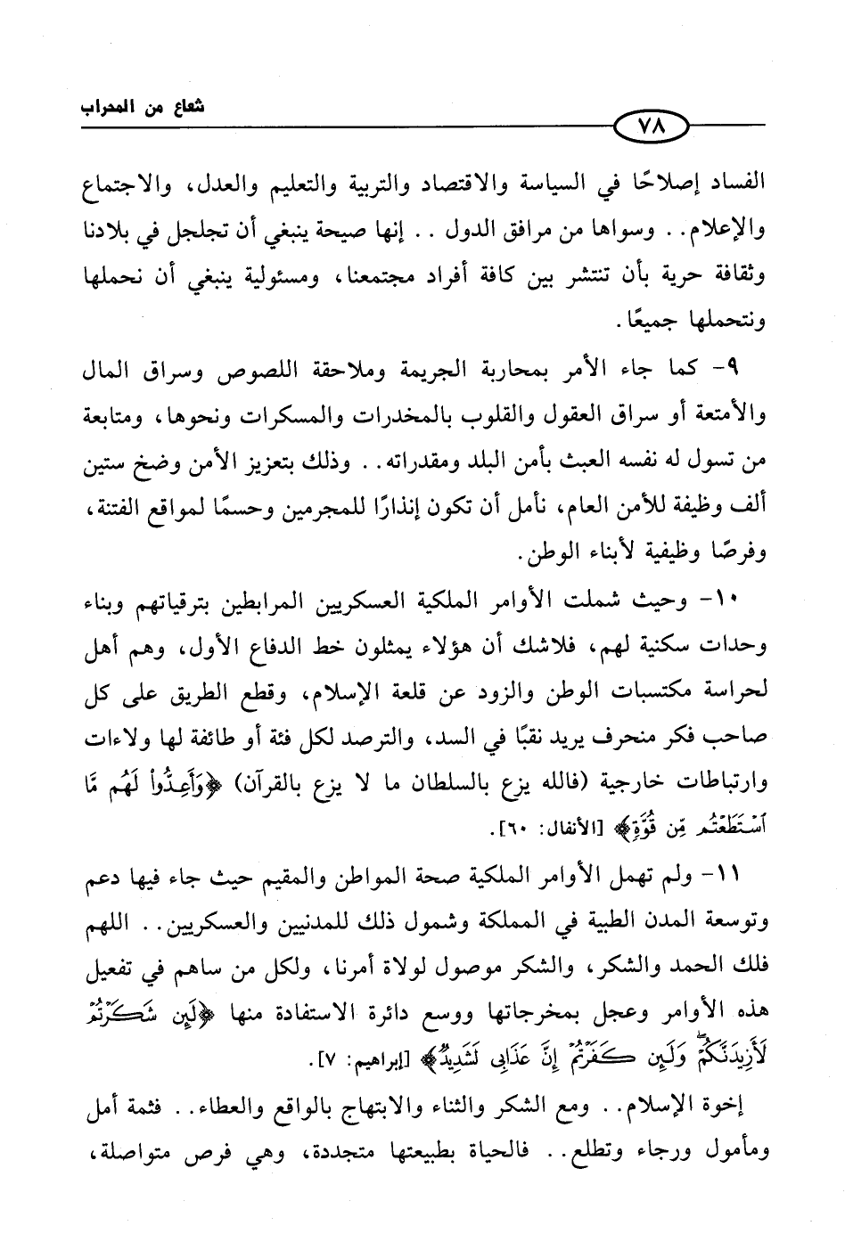 10 - وحيث شملت الأوامر الملكية العسكريين المرابطين بترقياتهم وبناء وحدات سكنية لهم، فلاشك أن هؤلاء يمثلون خط الدفاع الأول، وهم أهل لحراسة مكتسبات الوطن والزود عن قلعة الإسلام، وقطع الطريق على كل صاحب فكر منحرف يريد نقبًا في السد، والترصد لكل فئة أو طائفة لها ولاءات وارتباطات خارجية (فالله يزع بالسلطان ما لا يزع بالقرآن) {وَأَعِدُّوا لَهُم مَّا اسْتَطَعْتُم مِّن قُوَّةٍ}.