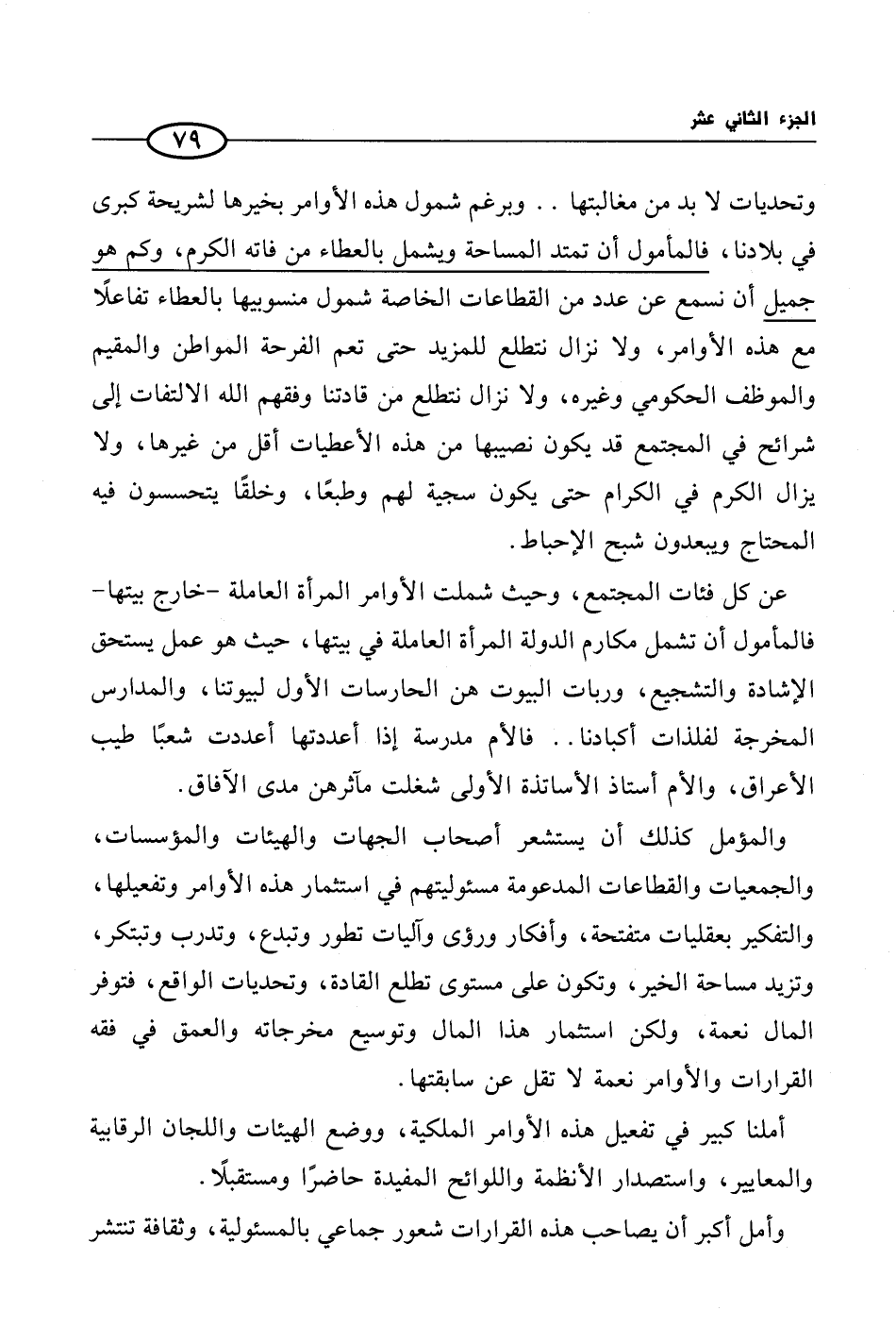 عن كل فئات المجتمع، وحيث شملت الأوامر المرأة العاملة - خارج بيتها- فالمأمول أن تشمل مكارم الدولة المرأة العاملة في بيتها، حيث هو عمل يستحق الإشادة والتشجيع، وربات البيوت هن الحارسات الأول لبيوتنا، والمدارس المخرجة لفلذات أكبادنا .. فالأم مدرسة إذا أعددتها أعددت شعبًا طيب الأعراق، والأم أستاذ الأساتذة الأولى شغلت مآثرهن مدى الآفاق.