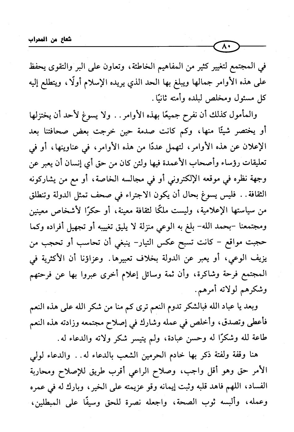 هنا وقفة ولفتة ذكر بها خادم الحرمين الشعب بالدعاء له .. والدعاء لولي الأمر حق وهو أقل واجب، وصلاح الراعي أقرب طريق للإصلاح ومحاربة الفساد، اللهم فاهد قلبه وثبت إيمانه وقو عزيمته على الخير، وبارك له في عمره وعمله، وألبسه ثوب الصحة، واجعله نصرة للحق وسيفًا على المبطلين،