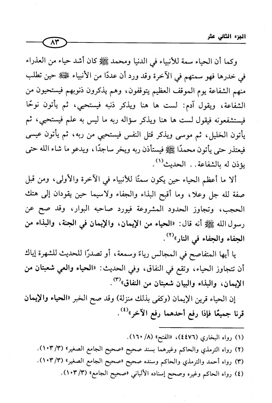 إن الحياء قرين الإيمان (وكفى بذلك منزلة) وقد صح الخبر «الحياء والإيمان قرنا جميعًا فإذا رفع أحدهما رفع الآخر» (¬4).