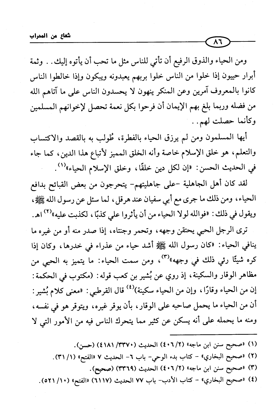 أيها المسلمون ومن لم يرزق الحياء بالفطرة، طُولب به بالقصد والاكتساب والتعلم، هو خلق الإسلام خاصة وأنه الخلق المميز لأتباع هذا الدين، كما جاء في الحديث الحسن: «إن لكل دين خلقًا، وخلق الإسلام الحياء» (¬1).