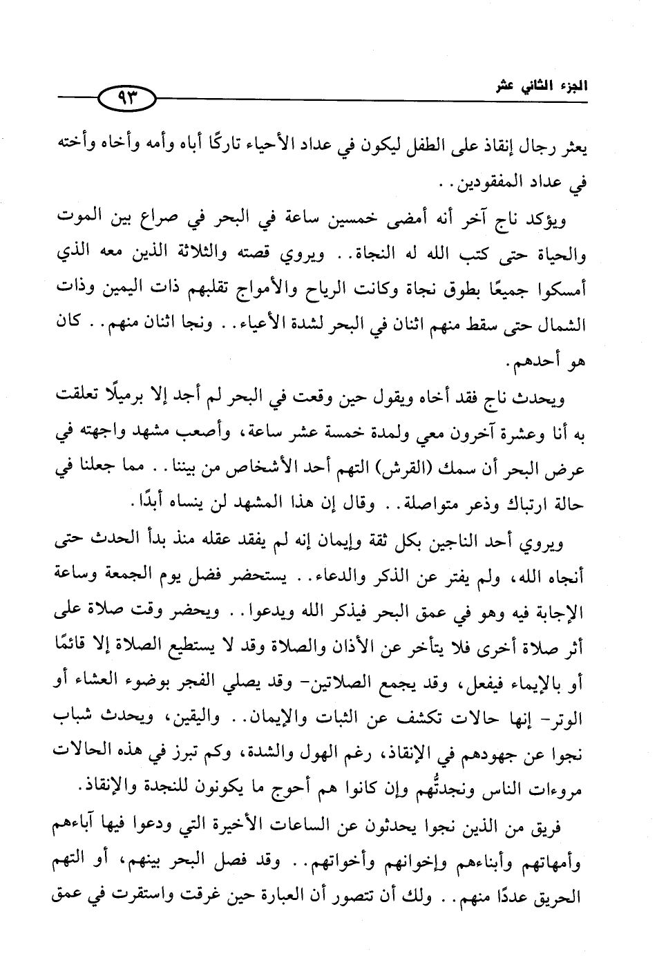 ويروي أحد الناجين بكل ثقة وإيمان إنه لم يفقد عقله منذ بدأ الحدث حتى أنجاه الله، ولم يفتر عن الذكر والدعاء .. يستحضر فضل يوم الجمعة وساعة الإجابة فيه وهو في عمق البحر فيذكر الله ويدعوا .. ويحضر وقت صلاة على أثر صلاة أخرى فلا يتأخر عن الأذان والصلاة وقد لا يستطيع الصلاة إلا قائمًا أو بالإيماء فيفعل، وقد يجمع الصلاتين- وقد يصلي الفجر بوضوء العشاء أو الوتر- إنها حالات تكشف عن الثبات والإيمان .. واليقين ويحدث شباب نجوا عن جهودهم في الإنقاذ، رغم الهول والشدة، وكم تبرز في هذه الحالات مروءات الناس ونجدتُّهم وإن كانوا هم أحوج ما يكونون للنجدة والإنقاذ.