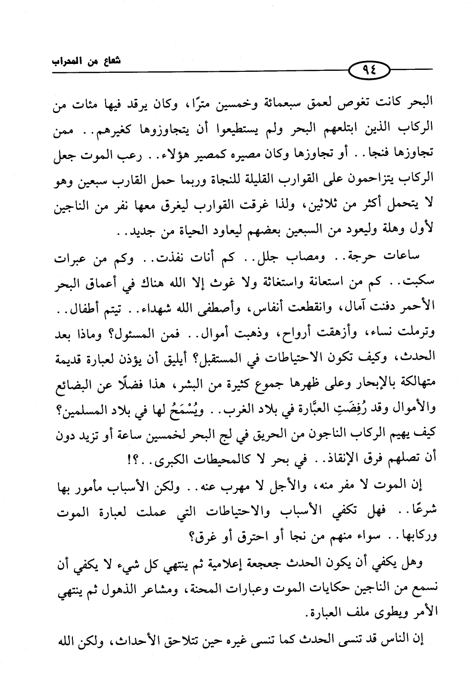 ساعات حرجة .. ومصاب جلل .. كم أنات نفذت .. وكم من عبرات سكبت .. كم من استعانة واستغاثة ولا غوث إلا الله هناك في أعماق البحر الأحمر دفنت آمال، وانقطعت أنفاس، وأصطفى الله شهداء .. تيتم أطفال .. وترملت نساء، وأزهقت أرواح، وذهبت أموال .. فمن المسئول؟ وماذا بعد الحدث، وكيف تكون الاحتياطات في المستقبل؟ أيليق أن يؤذن لعبارة قديمة متهالكة بالإبحار وعلى ظهرها جموع كثيرة من البشر، هذا فضلًا عن البضائع والأموال أثر فض العبارة في بلاد الغرب .. ويسمح لها في بلاد المسلمين؟ كيف يهيم الركاب الناجون من الحريق في لج البحر لخمسين ساعة أو تزيد دون أن تصلهم فرق الإنقاذ .. في بحر لا كالمحيطات الكبرى .. ؟ !