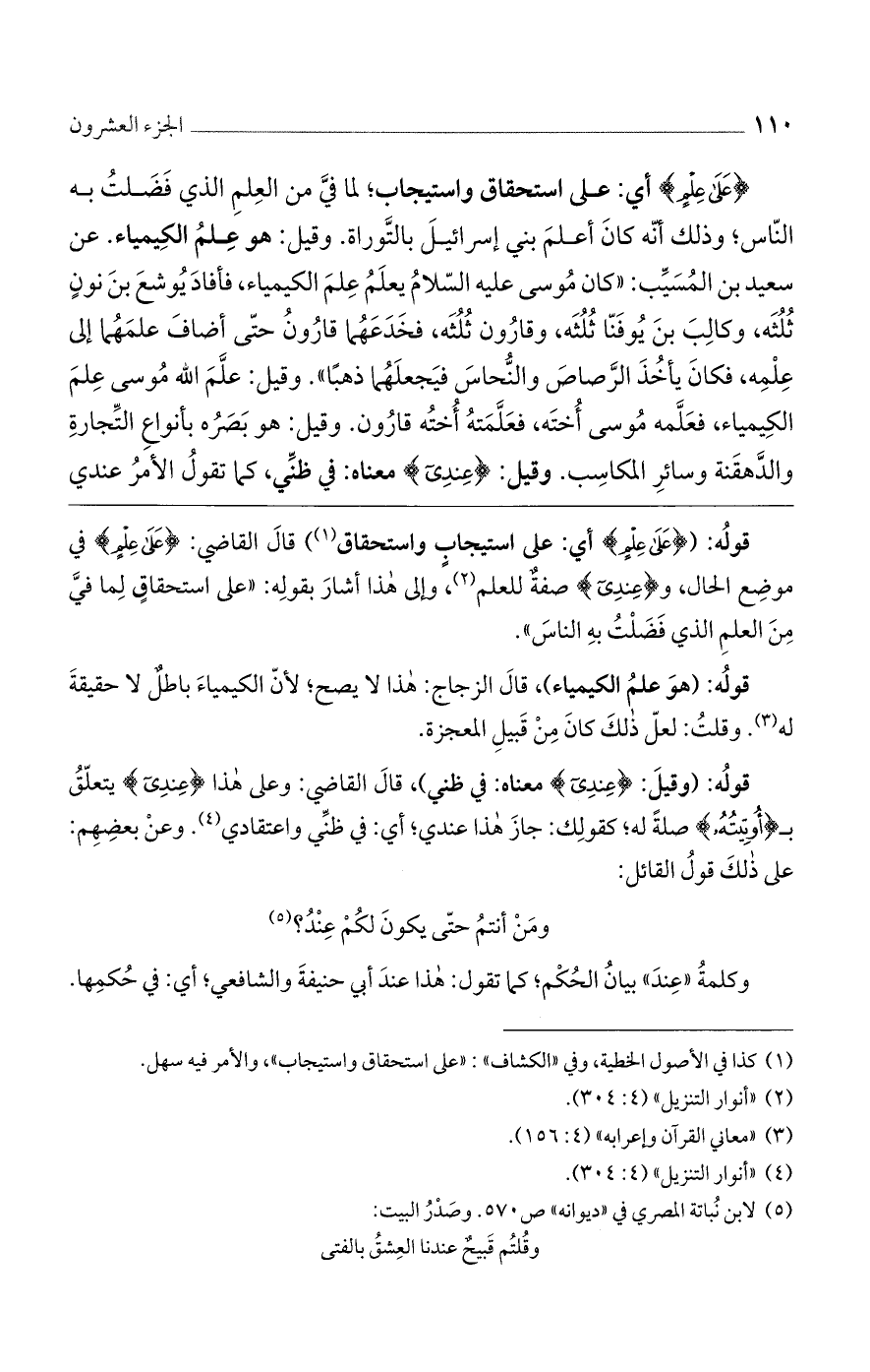قولُه: ({عَلَى عِلْمٍ} أي: على استيجابٍ واستحقاق) قالَ القاضي: {عَلَى عِلْمٍ} في موضِع الحال، و {عِندِي} صفةٌ للعلم، وإلى هذا أشارَ بقولِه: ((على استحقاقٍ لِما فيَّ مِنَ العلمِ الذي فَضَلْتُ بهِ الناسَ)).