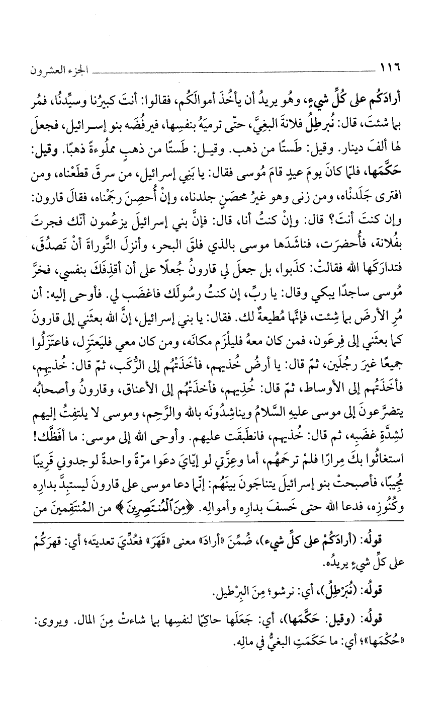أرادكم على كل شيءٍ، وهو يريد أن يأخذ أموالكم، فقالوا: أنت كبيرنا وسيدنا، فمر بما شئت، قال: نبرطل فلانة البغىّ، حتى ترميه بنفسها، فيرفضه بنو إسرائيل، فجعل لها ألف دينار. وقيل: طستاً من ذهب. وقيل: طستاً من ذهب مملوءةً ذهباً. وقيل: حكمها، فلما كان يوم عيدٍ قام موسى فقال: يا بنى إسرائيل، من سرق قطعناه، ومن افترى جلدناه، ومن زنى وهو غير محصنٍ جلدناه، وإن أحصن رجمناه، فقال قارون: وإن كنت أنت؟ قال: وإن كنت أنا، قال: فإنّ بنى إسرائيل يزعمون أنك فجرت بفلانة، فأحضرت، فناشدها موسى بالذي فلق البحر، وأنزل التوراة أن تصدق، فتداركها الله فقالت: كذبوا، بل جعل لي قارون جعلاً على أن أقذفك لنفسي، فخرّ موسى ساجداً يبكى وقال: يا رب، إن كنت رسولك فاغضب لي. فأوحى إليه: أن مر الأرض بما شئت، فإنها مطيعةٌ لك. فقال: يا بنى إسرائيل، إنّ الله بعثني إلى قارون كما بعثني إلى فرعون، فمن كان معه فليلزم مكانه، ومن كان معنى فليعتزل، فاعتزلوا جميعا غير رجلين، ثم قال: يا أرض خذيهم، فأخذتهم إلى الركب، ثم قال: خذيهم، فأخذتهم إلى الأوساط، ثم قال: خذيهم، فأخذتهم إلى الأعناق، وقارون وأصحابه يتضرعون إلى موسى عليه السلام ويناشدونه بالله والرحم، وموسى لا يلتفت اليهم لشدّة غضبه، ثم قال: خذيهم، فانطبقت عليهم. وأوحى الله إلى موسى: ما أفظك! استغاثوا بك مراراً فلم ترحمهم، أما وعزتي لو إياى دعوا مرةً واحدةً لوجدوني قريباً مجيباً، فأصبحت بنو إسرائيل يتناجون بينهم: إنما دعا موسى على قارون ليستبد بداره وكنوزه، فدعا الله حتى خسف بداره وأمواله. (مِنَ المُنْتَصِرِينَ) من المنتقمين من