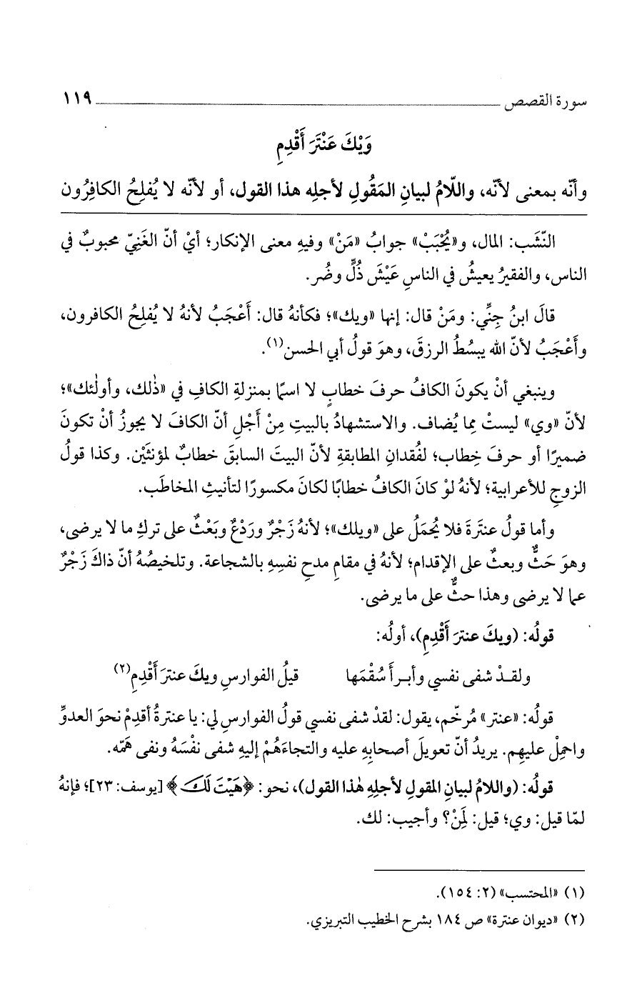 وأما قولُ عنتَرةَ فلا يُحمَلُ على ((ويلك))؛ لأنهُ زَجْرٌ ورَدْعٌ وبَعْثٌ على تركِ ما لا يرضى، وهوَ حَثٌّ وبعثٌ على الإقدام؛ لأنهُ في مقامِ مدحِ نفسِهِ بالشجاعة. وتلخيصُهُ أنّ ذاكَ زَجْرٌ عما لا يرضى وهذا حثٌّ على ما يرضى.
