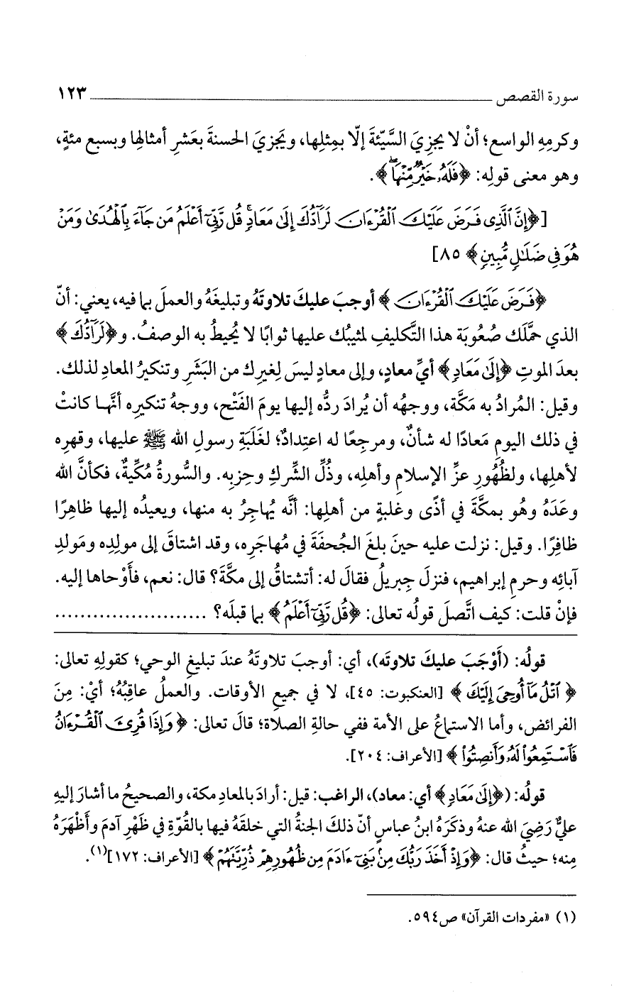 قولُه: ({إِلَى مَعَادٍ} أي: معاد)، الراغب: قيل: أرادَ بالمعادِ مكة، والصحيحُ ما أشارَ إليهِ عليٌّ رَضِيَ الله عنهُ وذكَرَهُ ابنُ عباسٍ أنّ ذلكَ الجنةُ التي خلقَهُ فيها بالقُوّةِ في ظَهْرِ آدمَ وأَظْهَرَهُ مِنه؛ حيثُ قال: {وَإِذْ أَخَذَ رَبُّكَ مِن بَنِي آدَمَ مِن ظُهُورِهِمْ ذَرِّيَّتَهُمْ} [الأعراف: 172].