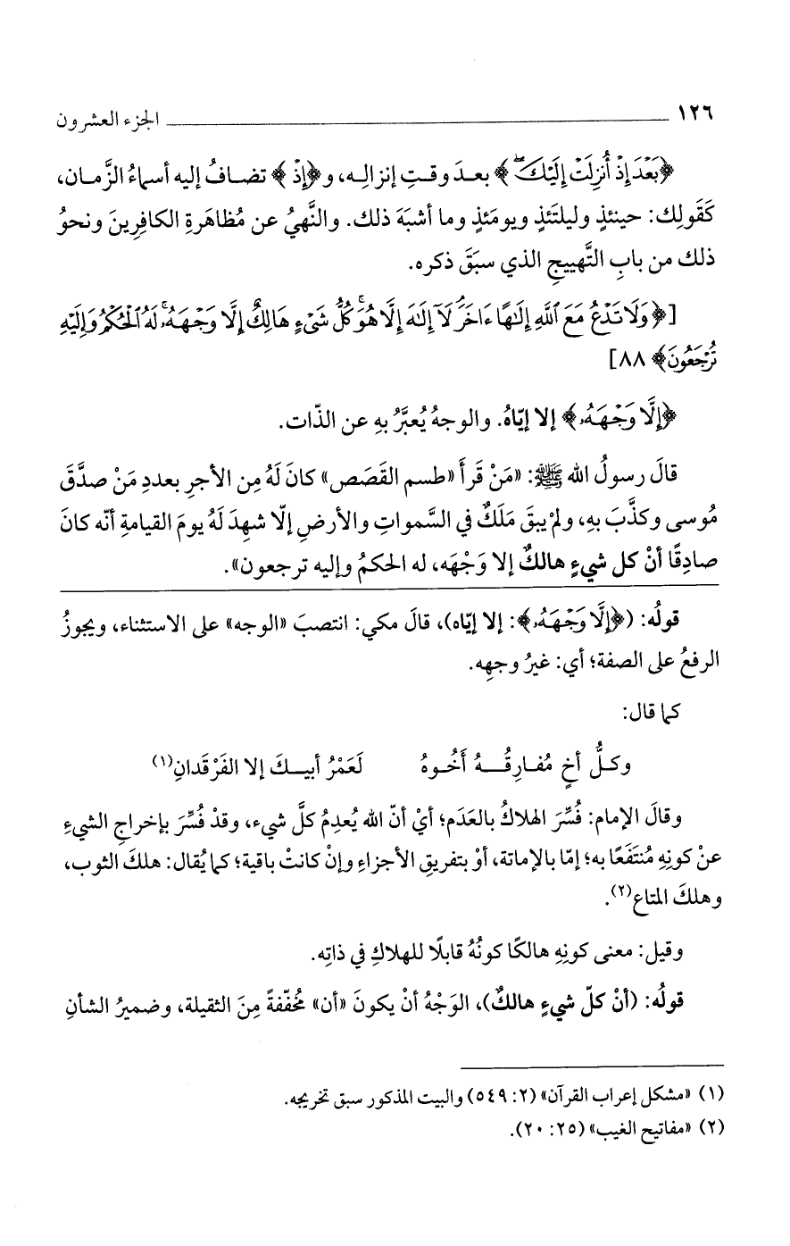 قولُه: ({إِلاَّ وَجْهُهُ,}: إلا إيّاه)، قالَ مكي: انتصبَ ((الوجه)) على الاستثناء، ويجوزُ الرفعُ على الصفة؛ أي: غيرُ وجهِه.