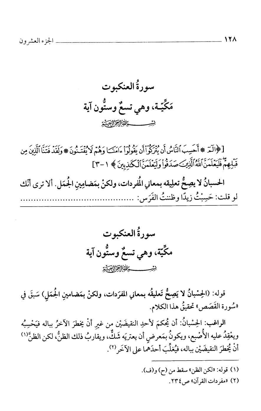 قوله: (الحِسْبانُ لا يَصِحُّ تَعليقُه بمعاني المفرَدات، ولكنْ بمَضامينِ الجُمَلِ) سَبَقَ في ((سُورة القَصَص)) تحقيقُ هذا الكلام.
