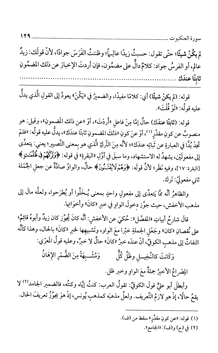 قالَ شارحُ أبياتِ ((المفصَّل)): حُكيَ عن الأخفشِ: أنَّه كانَ يُجوِّز كان زيدٌ وأبوهُ قائِمٌ؛ على نُقصانِ ((كان)) وجَعْلِ الجملةِ خبرًا معَ الواو، وتَشبيهِها لخبرِ ((كانَ)) بالحال، وهذا كأنَّه التفاتٌ إلى مذهبِ الكوفيِّ، أنّ عندَه خبرُ ((كانَ)) حالٌ لا خبرٌ، وعليه قولُ المَعرّي: