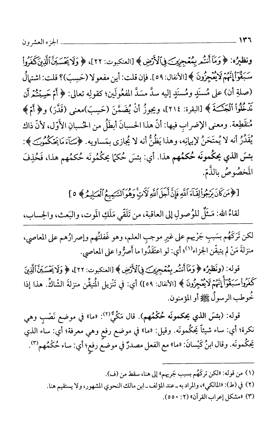 ونظيره: (وَما أَنْتُمْ بِمُعْجِزِينَ فِي الْأَرْضِ)] العنكبوت: 22 [، (وَلا يَحْسَبَنَّ الَّذِينَ كَفَرُوا سَبَقُوا إِنَّهُمْ لا يُعْجِزُونَ)] الأنفال: 59 [. فإن قلت: أين مفعولا (حسب)؟ قلت: اشتمال (صلة أن) على مسنٍد ومسنٍد إليه سدّ مسدّ المفعولين؛ كقوله تعالى: (أَمْ حَسِبْتُمْ أَنْ تَدْخُلُوا الْجَنَّةَ)] البقرة: 214 [، ويجوز أن يضمن (حسب) معنى (قدر) و (أم) منقطعة. ومعنى الإضراب فيها: أن هذا الحسبان أبطل من الحسبان الأوّل، لأن ذاك يقدر أنه لا يمتحن لإيمانه، وهذا يظن أنه لا يجازى بمساويه. (ساءَ ما يَحْكُمُونَ): بئس الذي يحكمونه حكمهم هذا. أو بئس حكمًا يحكمونه حكمهم هذا، فحذف المخصوص بالذم.