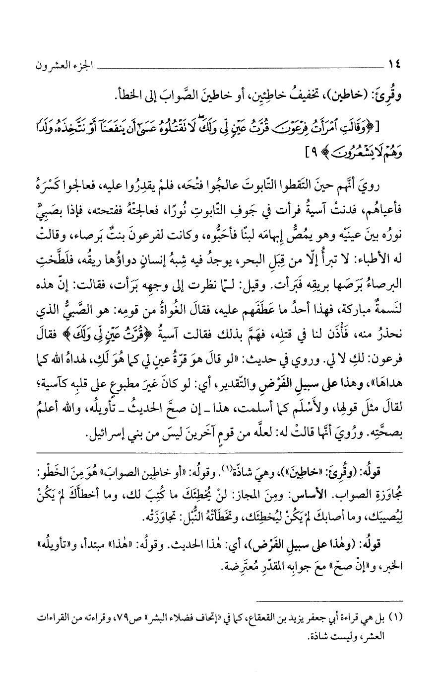 رويَ أنَّهم حينَ التَقطوا التّابوتَ عالجُوا فتْحَة، فلمْ يقدِرُوا عليه، فعالجوا كَسْرَهُ فأعياهُم، فدنتْ آسيةُ فرأت في جَوفِ التّابوتِ نُورًا، فعالجتْهُ ففتحته، فإذا بصَبِيِّ نورُه بينَ عينَيْه وهو يمُصُّ إِبهامَه لبنًا فأحَبُّوه، وكانت لفرعونَ بنتٌ بَرصاء، وقالتْ له الأطباء: لا تبرأُ إلاّ من قِبَلِ البحر، يوجدُ فيه شِبهُ إنسانٍ دواؤُها ريقُه، فلطَّختِ البرصاءُ بَرَصَها بريقِه فَبَرأت. وقيل: لمّا نظرت إلى وجهِه بَرَأت، فقالت: إنّ هذه لنَسمةٌ مباركة، فهذا أحدُ ما عَطَفَهم عليه، فقالَ الغُواةُ من قومِه: هو الصَّبيُّ الذي نحذرُ منه، فَاذَن لنا في قتلِه، فهَمَّ بذلك فقالت آسيةُ {قُرَّتُ عَيْنٍ لِي وَلَكَ} فقالَ فرعون: لكِ لا لي. وروي في حديث: ((لو قالَ هوَ قرّةُ عينٍ لي كما هُوَ لَكِ، لهداهُ الله كما هداهَا))، وهذا على سبيلِ الفَرْضِ والتّقدير، أي: لو كانَ غيرَ مطبوعٍ على قلبِه كآسية؛ لقالَ مثلَ قولِها، ولأَسْلَم كما أسلمت، هذا -إن صحَّ الحديثُ- تأويلُه، والله أعلمُ بصحَّتِه. ورُويَ أنَّها قالتْ له: لعلَّه من قومٍ آخرينَ ليسَ من بني إسرائيل.