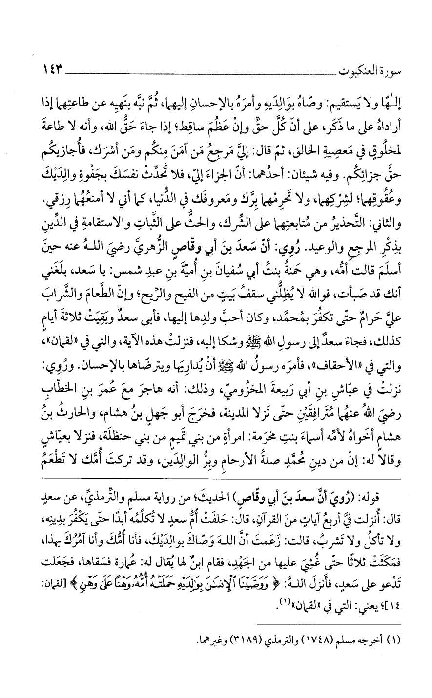 قوله: (رُويَ أنَّ سعدَ بنَ أبي وقّاصٍ) الحديثَ؛ من رواية مسلمٍ والتِّرمذيِّ، عن سعدٍ قال: أُنزلت فيَّ أربعُ آياتٍ منَ القرآنِ، قال: حَلفَتْ أُمُّ سعدٍ لا تُكلِّمُه أبدًا حتّى يَكْفُرَ بدِينِه، ولا تأكلُ ولا تَشربُ، قالت: زَعَمتُ أنَّ اللهَ وَصّاكَ بوالِدَيْكَ، فأنا أُمُّكَ وأنا آمُرُكَ بهذا، فمَكَثَتْ ثلاثًا حتّى غُشِيَ عليها من الجَهْدِ، فقام ابنٌ يُقال له: عُمارة فسَقاها، فجَعَلت تَدْعو على سَعدٍ، فأَنزلَ اللهُ: {وَوَصَّيْنَا الإِنسَانَ بِوَالِدَيْهِ حَمَلَتْهُ أُمُّهُ, وَهْنًا عَلَى وَهْنٍ} [لقمان: 14]؛ يعني: التي في ((لقمان)).
