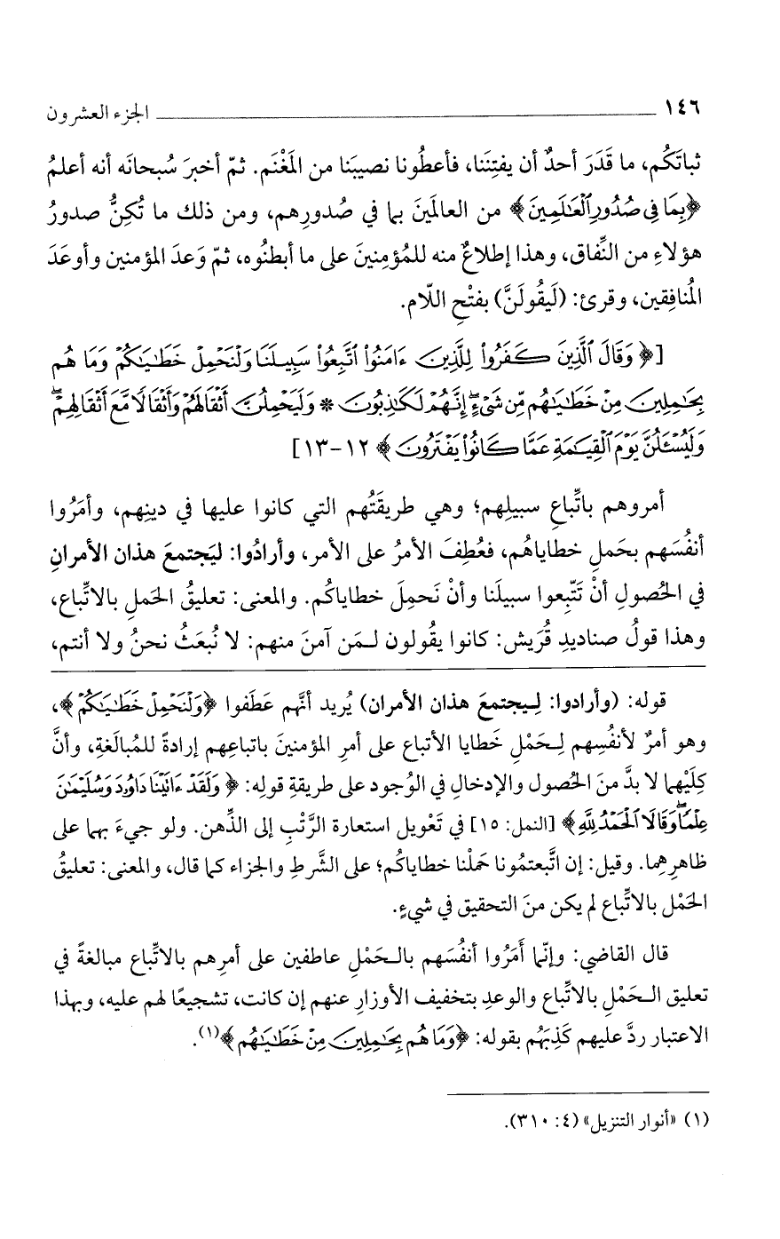(وَقالَ الَّذِينَ كَفَرُوا لِلَّذِينَ آمَنُوا اتَّبِعُوا سَبِيلَنا وَلْنَحْمِلْ خَطاياكُمْ وَما هُمْ بِحامِلِينَ مِنْ خَطاياهُمْ مِنْ شَيْءٍ إِنَّهُمْ لَكاذِبُونَ (12) وَلَيَحْمِلُنَّ أَثْقالَهُمْ وَأَثْقالاً مَعَ أَثْقالِهِمْ وَلَيُسْئَلُنَّ يَوْمَ الْقِيامَةِ عَمَّا كانُوا يَفْتَرُونَ)] 12 - 13 [