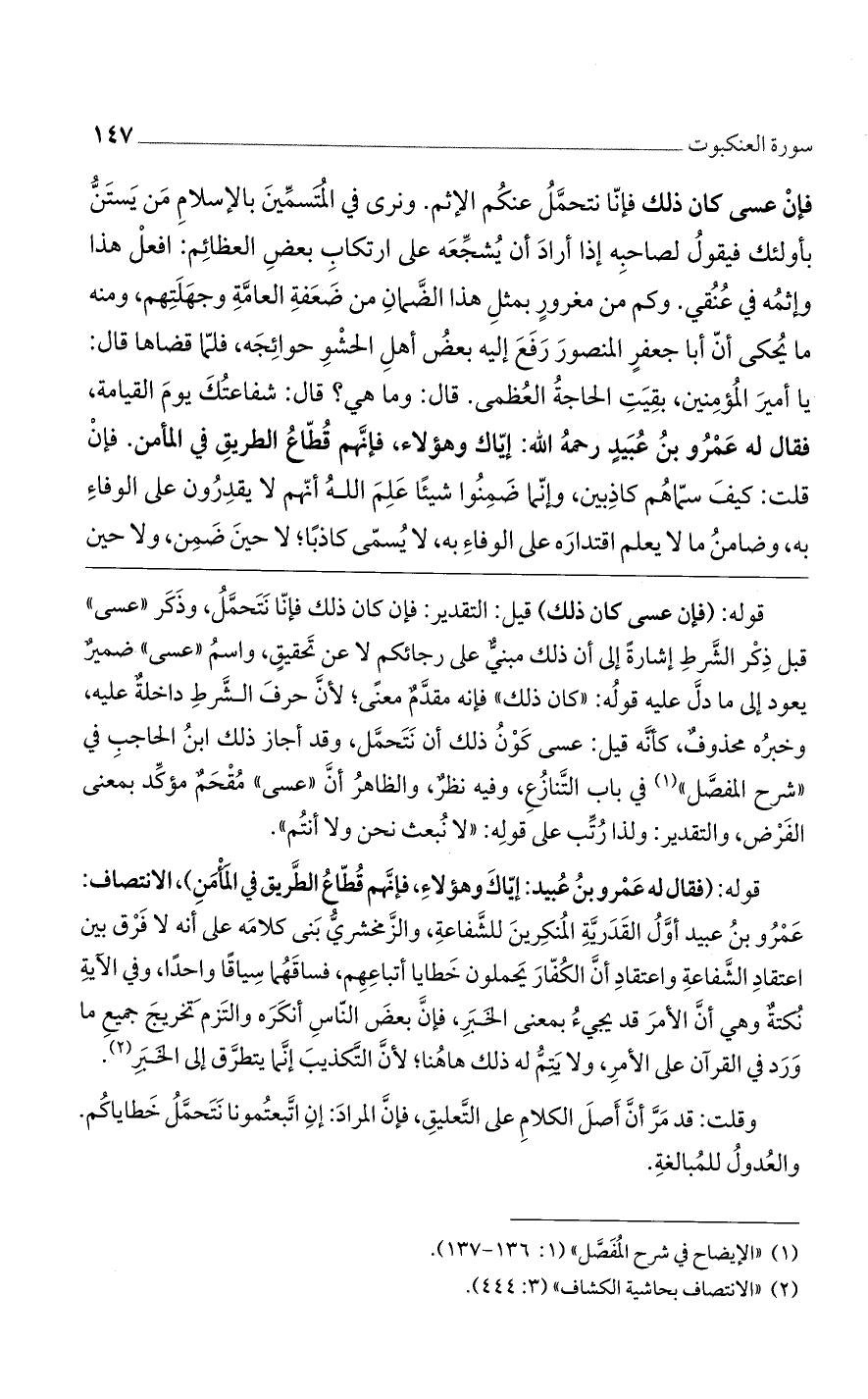 قوله: (فقال له عَمْرو بنُ عُبيد: إيّاكَ وهؤلاءِ، فإنَّهم قُطّاعُ الطَّريق في المَامَنِ)، الإنتصاف: عَمْرُو بنُ عبيد أوَّلُ القَدَريَّةِ المُنكِرينَ للشَّفاعةِ، والزَّمخشريُّ بَني كلامَه على أنه لا فَرق بين اعتقادِ أنَّ الكُفّارَ يَحملون خَطايا أتباعِهِم، فساقَهُما سِياقًا واحدًا، وفي الآيةِ نُكتةٌ وهي أنَّ الأمرَ قد يجيءُ بمعنى الخَبَرِ، فإنَّ بعضَ النّاسِ أنكَرَه والتَزم تَخريجَ جميعِ ما وَرَد في القرآن على الأمرِ، ولا يَتِمُّ له ذلك هاهُنا؛ لأنَّ التَّكذيبَ إنَّما يتطرَّق إلى الخَبَرِ.